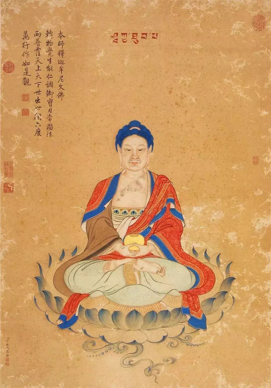 释迦牟尼佛像。身披红色蓝边大衣,前胸微袒。肉髻螺发,持钵坐于莲花宝座之上,手做禅定印,这是佛陀入于禅定时所结的手印。