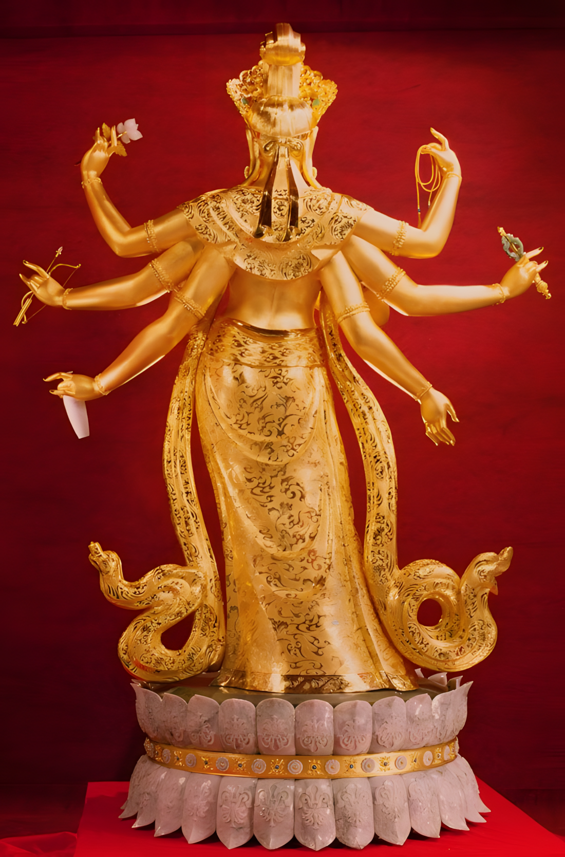 这尊金玉观音采用世界手工艺之一绝的中国传统“宫廷金细工”敬造,历时两载创作完成。观音金身由200多平均壁厚1.2毫米的金片,经过手工锻打成型,再焊接为一体,并采用中国传统的花丝镶嵌、金錾、玉雕等宫廷手工技艺精心敬造完成。