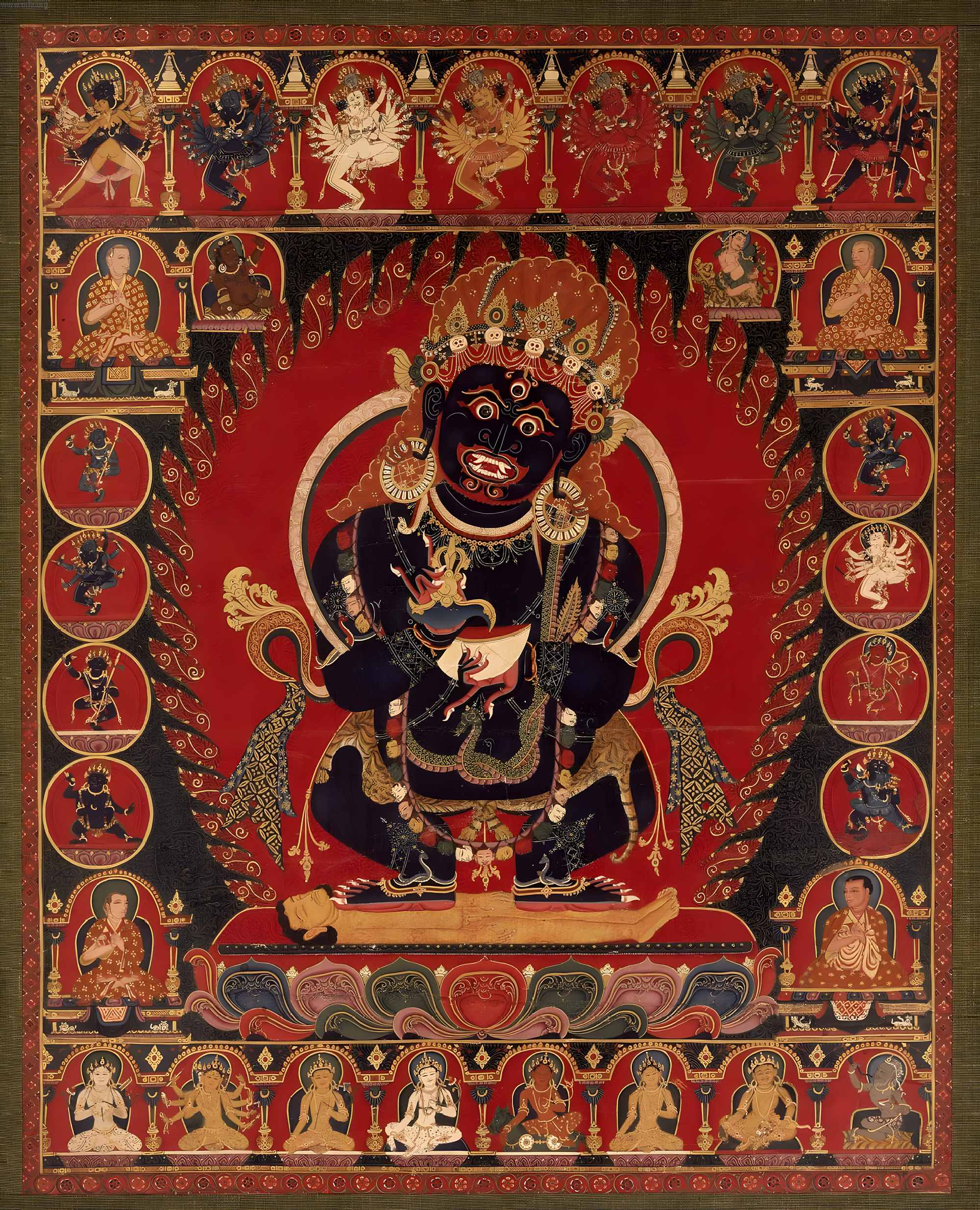 唐卡有许多不寻常的特征,包括背光光晕的形状和放置莲花的五彩岩石基座,这与任何其他已知的玛哈嘎拉绘画中所描绘的都不同;而在光晕四角外,成对儿放置八个火葬场所,也就是尸陀林的寒林八所的表达方式,无疑是为了符合构图的需要。每一个小场景都涵盖了比平常更多的内容,但每一个又都细致完整一丝不苟。这样的表现形式很容易让人联想起更早期的尼泊尔手稿中的优雅插图。确实,这位不知名的大师创作了这幅色彩明亮的生动绘画,且他清楚地知道这是各种风格的一次伟大融合,神灵和葬所被渲染成尼泊尔和萨迦风格,而顶栏的的岩石边框和人物又都遵循藏式绘画风格。不寻常的是两边的两个塔形建筑,一个下部中央开塔形门,另一个则是带有神龛,均带有覆钵形上部结构,这很可能是源自西藏西部的建筑样式。