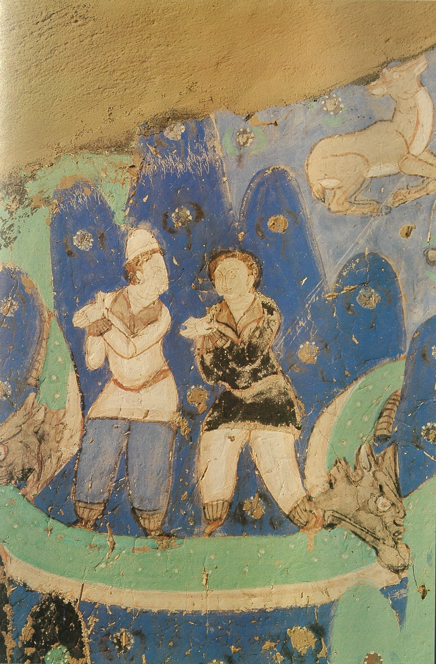 克孜尔石窟又称克孜尔千佛洞。“克孜尔”是维吾尔语“红色”的意思,大概因为雀尔达格山色赭红,故在此山上所凿石窟叫“克孜尔石窟”。库木吐拉是维吾尔语“沙漠中的烽火台”的意思。它位于西域佛教艺术东传翻越葱岭、丝绸之路北线沿塔克拉玛干沙漠——塔里木盆地绿洲驿站上的第一站:河西诸石窟。其西有阿富汗巴米扬石窟群,其东有敦煌石窟。作为古龟兹佛教石窟寺的代表,克孜尔石窟中最常见的壁画图像是佛传、本生和因缘故事,反映了古代龟兹国流行的从中亚古犍陀罗地区经过罽宾传来的小乘佛教信仰。