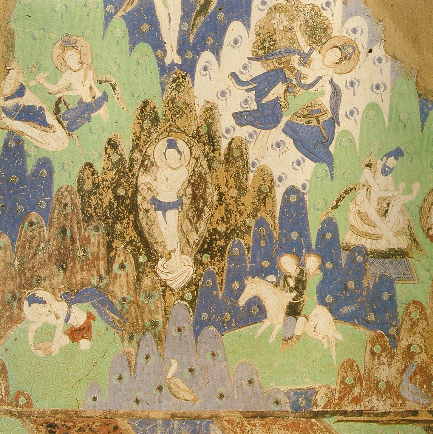 各洞窟中最常见的除了本生故事就是《涅槃经图》或称《涅槃经变图》。主要表现的是《大般泥洹经》的内容。德国考察队在上个世纪初在克孜尔石窟曾发现了一些梵文的《大般泥洹经》的写本和残片,一般认为是小乘“说一切有部”的经籍。