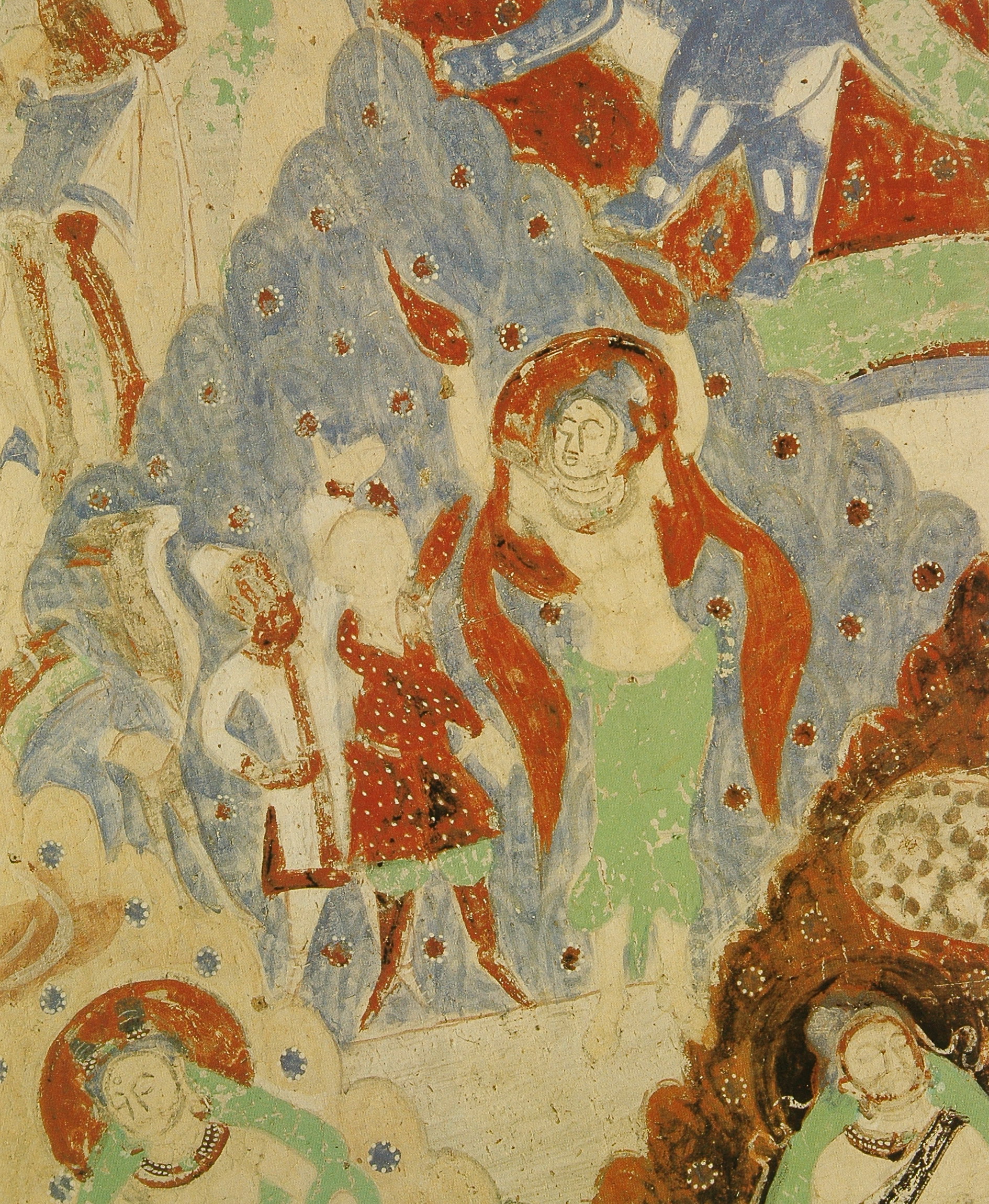 各洞窟中最常见的除了本生故事就是《涅槃经图》或称《涅槃经变图》。主要表现的是《大般泥洹经》的内容。德国考察队在上个世纪初在克孜尔石窟曾发现了一些梵文的《大般泥洹经》的写本和残片,一般认为是小乘“说一切有部”的经籍。