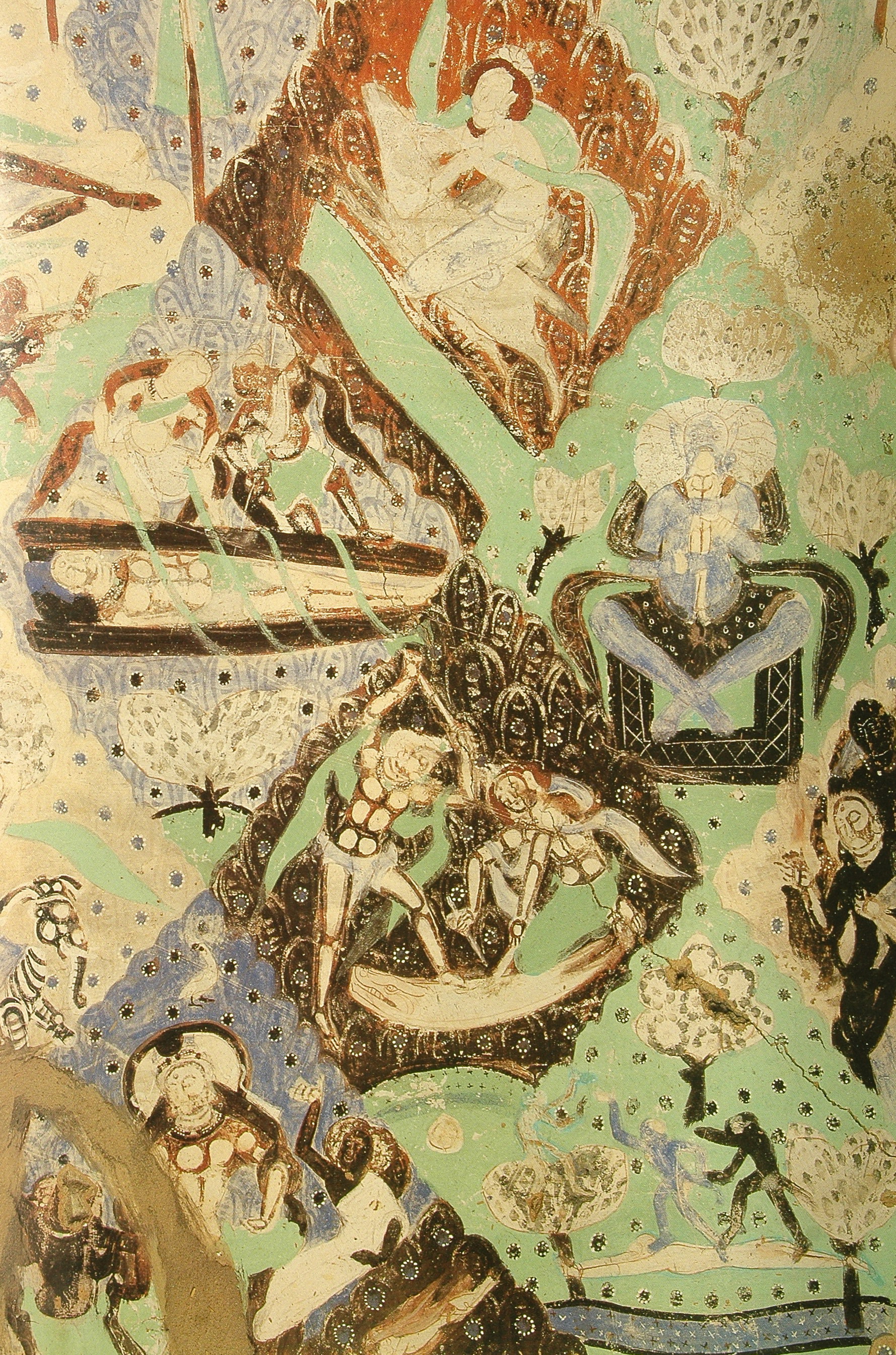 各洞窟中最常见的除了本生故事就是《涅槃经图》或称《涅槃经变图》。主要表现的是《大般泥洹经》的内容。德国考察队在上个世纪初在克孜尔石窟曾发现了一些梵文的《大般泥洹经》的写本和残片,一般认为是小乘“说一切有部”的经籍。