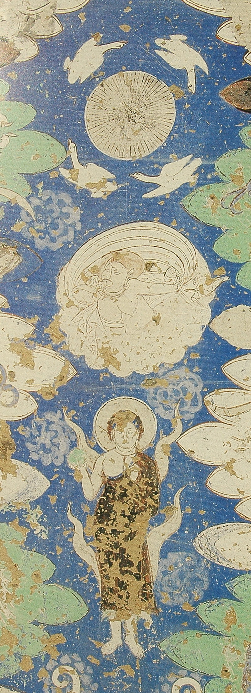 表现释迦入灭的涅槃图像,最初出现于犍陀罗,后来经过中亚沿丝绸之路传入中国新疆。在犍陀罗表现与涅槃有关的各个场面中,最重视的是释迦涅槃场面。犍陀罗地区出现的涅槃图,是这一图像最古老的样式,其主要特征是:娑罗双树下,佛陀右胁而卧。如出土于的罗里延-唐盖(Loriyan Tangai)的涅槃图像浮雕,为二至三世纪的作品,现藏印度加尔各答博物馆,除了卧佛之外,还包括了悲泣痛哭的人物二十余身。又如出土于塔克依-贝依(Takhi Behi),现藏于白沙瓦博物馆的佛传浮雕原是一块雕刻在佛塔或寺院石碑上的浮雕,石碑的中央部分分成五格,自上而下,最下格即饰有涅槃像,在娑罗双树下,佛陀右胁而卧,在佛陀的足边围着伤心欲绝的徒众们,一位手执锡杖的尊者──迦叶尊者,他并未赶上见佛陀最后的一面,而是闻声赶来奔丧。这类涅槃像是属于佛传故事的一部分,而非单独的涅槃像。法国学者福歇(A. Foucher)在对这一犍陀罗图像分析研究的基础上,确定了涅槃图像的古典图式,日本学者宫治昭则指出了犍陀罗地区这一图像所用的经典均为小乘派系的涅槃经。现存的犍陀罗涅槃图作品广为人知的就有七十多件,全部为浮雕。尽管这些作品呈现出诸多变化,但其基本表现结构是一致的:在横长图像构图上面两端配置娑罗双树,构图中心为宽大的寝台,释迦侧卧于上,周围点缀着涅槃经中记述的一些故事情节和无限悲伤的僧俗、诸神等。娑罗树常见于喜马拉雅山麓到印度全境,是一种半落叶且高大的乔木,每年三月前后开白色小花。巴利文佛经注释这样解释娑罗树说:两棵娑罗树根干枝叶纠缠在一起,宛如一棵大树,在犍陀罗的涅槃图中,释迦的枕边和足端各有一棵,表现的就是双娑罗树,而有时会在背景上绘有三棵以上娑罗树,代表着佛经中所说的“娑罗林”“娑罗园”。