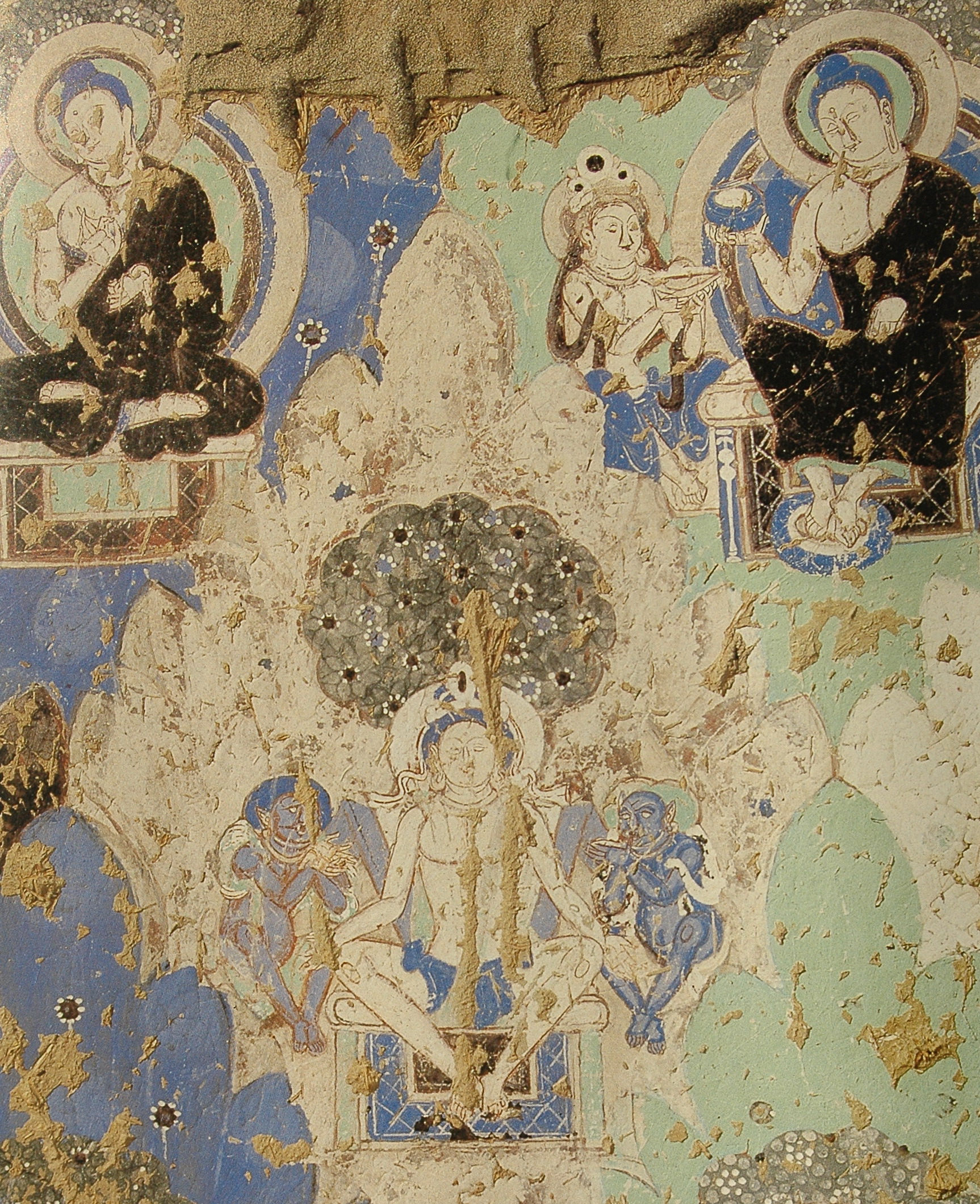 表现释迦入灭的涅槃图像,最初出现于犍陀罗,后来经过中亚沿丝绸之路传入中国新疆。在犍陀罗表现与涅槃有关的各个场面中,最重视的是释迦涅槃场面。犍陀罗地区出现的涅槃图,是这一图像最古老的样式,其主要特征是:娑罗双树下,佛陀右胁而卧。如出土于的罗里延-唐盖(Loriyan Tangai)的涅槃图像浮雕,为二至三世纪的作品,现藏印度加尔各答博物馆,除了卧佛之外,还包括了悲泣痛哭的人物二十余身。又如出土于塔克依-贝依(Takhi Behi),现藏于白沙瓦博物馆的佛传浮雕原是一块雕刻在佛塔或寺院石碑上的浮雕,石碑的中央部分分成五格,自上而下,最下格即饰有涅槃像,在娑罗双树下,佛陀右胁而卧,在佛陀的足边围着伤心欲绝的徒众们,一位手执锡杖的尊者──迦叶尊者,他并未赶上见佛陀最后的一面,而是闻声赶来奔丧。这类涅槃像是属于佛传故事的一部分,而非单独的涅槃像。法国学者福歇(A. Foucher)在对这一犍陀罗图像分析研究的基础上,确定了涅槃图像的古典图式,日本学者宫治昭则指出了犍陀罗地区这一图像所用的经典均为小乘派系的涅槃经。现存的犍陀罗涅槃图作品广为人知的就有七十多件,全部为浮雕。尽管这些作品呈现出诸多变化,但其基本表现结构是一致的:在横长图像构图上面两端配置娑罗双树,构图中心为宽大的寝台,释迦侧卧于上,周围点缀着涅槃经中记述的一些故事情节和无限悲伤的僧俗、诸神等。娑罗树常见于喜马拉雅山麓到印度全境,是一种半落叶且高大的乔木,每年三月前后开白色小花。巴利文佛经注释这样解释娑罗树说:两棵娑罗树根干枝叶纠缠在一起,宛如一棵大树,在犍陀罗的涅槃图中,释迦的枕边和足端各有一棵,表现的就是双娑罗树,而有时会在背景上绘有三棵以上娑罗树,代表着佛经中所说的“娑罗林”“娑罗园”。