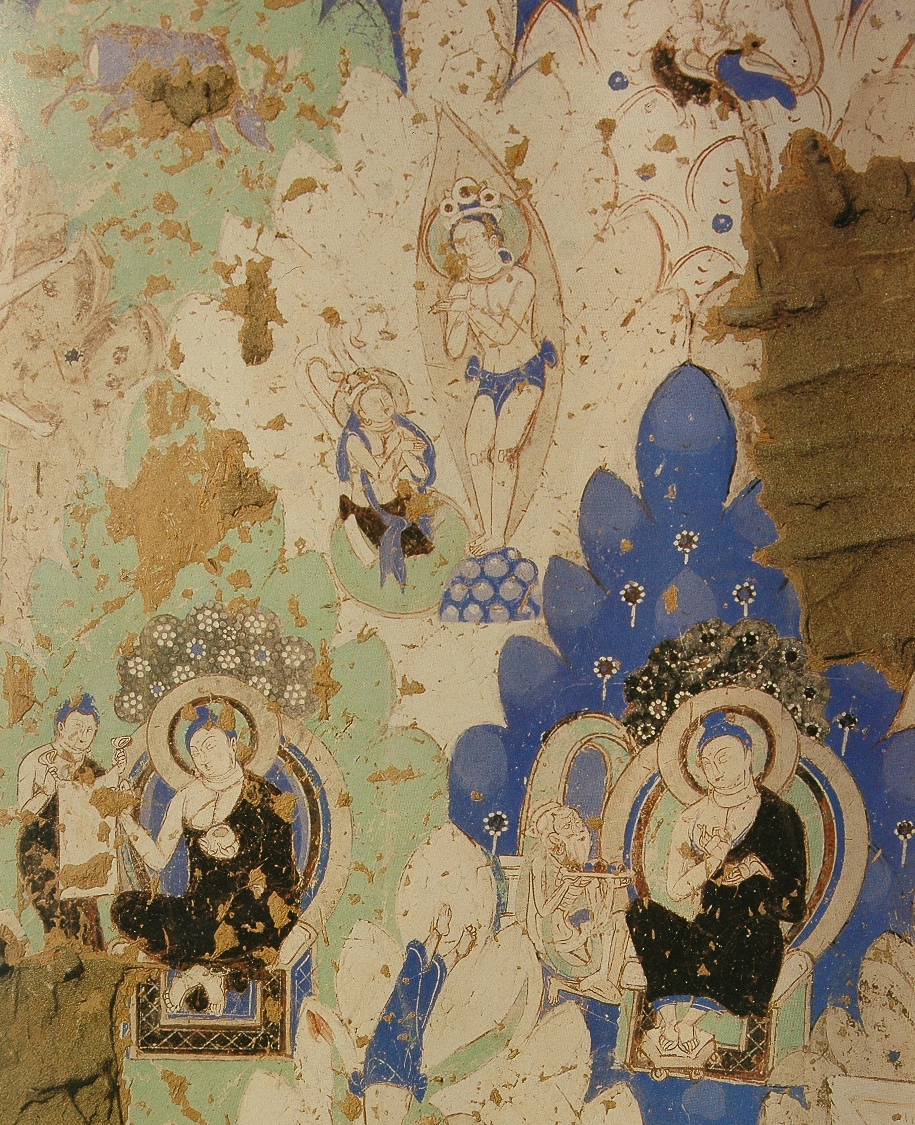 表现释迦入灭的涅槃图像,最初出现于犍陀罗,后来经过中亚沿丝绸之路传入中国新疆。在犍陀罗表现与涅槃有关的各个场面中,最重视的是释迦涅槃场面。犍陀罗地区出现的涅槃图,是这一图像最古老的样式,其主要特征是:娑罗双树下,佛陀右胁而卧。如出土于的罗里延-唐盖(Loriyan Tangai)的涅槃图像浮雕,为二至三世纪的作品,现藏印度加尔各答博物馆,除了卧佛之外,还包括了悲泣痛哭的人物二十余身。又如出土于塔克依-贝依(Takhi Behi),现藏于白沙瓦博物馆的佛传浮雕原是一块雕刻在佛塔或寺院石碑上的浮雕,石碑的中央部分分成五格,自上而下,最下格即饰有涅槃像,在娑罗双树下,佛陀右胁而卧,在佛陀的足边围着伤心欲绝的徒众们,一位手执锡杖的尊者──迦叶尊者,他并未赶上见佛陀最后的一面,而是闻声赶来奔丧。这类涅槃像是属于佛传故事的一部分,而非单独的涅槃像。法国学者福歇(A. Foucher)在对这一犍陀罗图像分析研究的基础上,确定了涅槃图像的古典图式,日本学者宫治昭则指出了犍陀罗地区这一图像所用的经典均为小乘派系的涅槃经。现存的犍陀罗涅槃图作品广为人知的就有七十多件,全部为浮雕。尽管这些作品呈现出诸多变化,但其基本表现结构是一致的:在横长图像构图上面两端配置娑罗双树,构图中心为宽大的寝台,释迦侧卧于上,周围点缀着涅槃经中记述的一些故事情节和无限悲伤的僧俗、诸神等。娑罗树常见于喜马拉雅山麓到印度全境,是一种半落叶且高大的乔木,每年三月前后开白色小花。巴利文佛经注释这样解释娑罗树说:两棵娑罗树根干枝叶纠缠在一起,宛如一棵大树,在犍陀罗的涅槃图中,释迦的枕边和足端各有一棵,表现的就是双娑罗树,而有时会在背景上绘有三棵以上娑罗树,代表着佛经中所说的“娑罗林”“娑罗园”。