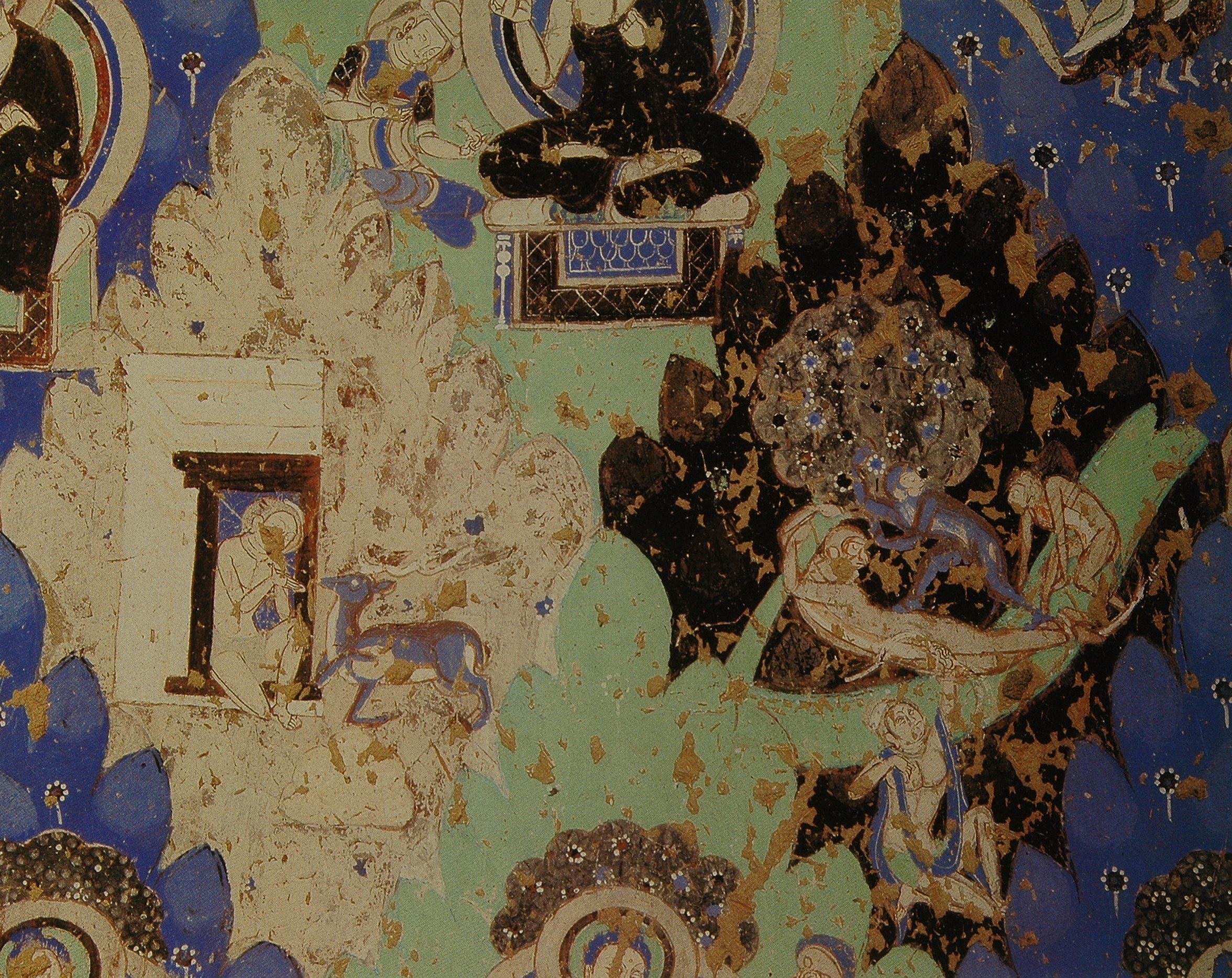 表现释迦入灭的涅槃图像,最初出现于犍陀罗,后来经过中亚沿丝绸之路传入中国新疆。在犍陀罗表现与涅槃有关的各个场面中,最重视的是释迦涅槃场面。犍陀罗地区出现的涅槃图,是这一图像最古老的样式,其主要特征是:娑罗双树下,佛陀右胁而卧。如出土于的罗里延-唐盖(Loriyan Tangai)的涅槃图像浮雕,为二至三世纪的作品,现藏印度加尔各答博物馆,除了卧佛之外,还包括了悲泣痛哭的人物二十余身。又如出土于塔克依-贝依(Takhi Behi),现藏于白沙瓦博物馆的佛传浮雕原是一块雕刻在佛塔或寺院石碑上的浮雕,石碑的中央部分分成五格,自上而下,最下格即饰有涅槃像,在娑罗双树下,佛陀右胁而卧,在佛陀的足边围着伤心欲绝的徒众们,一位手执锡杖的尊者──迦叶尊者,他并未赶上见佛陀最后的一面,而是闻声赶来奔丧。这类涅槃像是属于佛传故事的一部分,而非单独的涅槃像。法国学者福歇(A. Foucher)在对这一犍陀罗图像分析研究的基础上,确定了涅槃图像的古典图式,日本学者宫治昭则指出了犍陀罗地区这一图像所用的经典均为小乘派系的涅槃经。现存的犍陀罗涅槃图作品广为人知的就有七十多件,全部为浮雕。尽管这些作品呈现出诸多变化,但其基本表现结构是一致的:在横长图像构图上面两端配置娑罗双树,构图中心为宽大的寝台,释迦侧卧于上,周围点缀着涅槃经中记述的一些故事情节和无限悲伤的僧俗、诸神等。娑罗树常见于喜马拉雅山麓到印度全境,是一种半落叶且高大的乔木,每年三月前后开白色小花。巴利文佛经注释这样解释娑罗树说:两棵娑罗树根干枝叶纠缠在一起,宛如一棵大树,在犍陀罗的涅槃图中,释迦的枕边和足端各有一棵,表现的就是双娑罗树,而有时会在背景上绘有三棵以上娑罗树,代表着佛经中所说的“娑罗林”“娑罗园”。