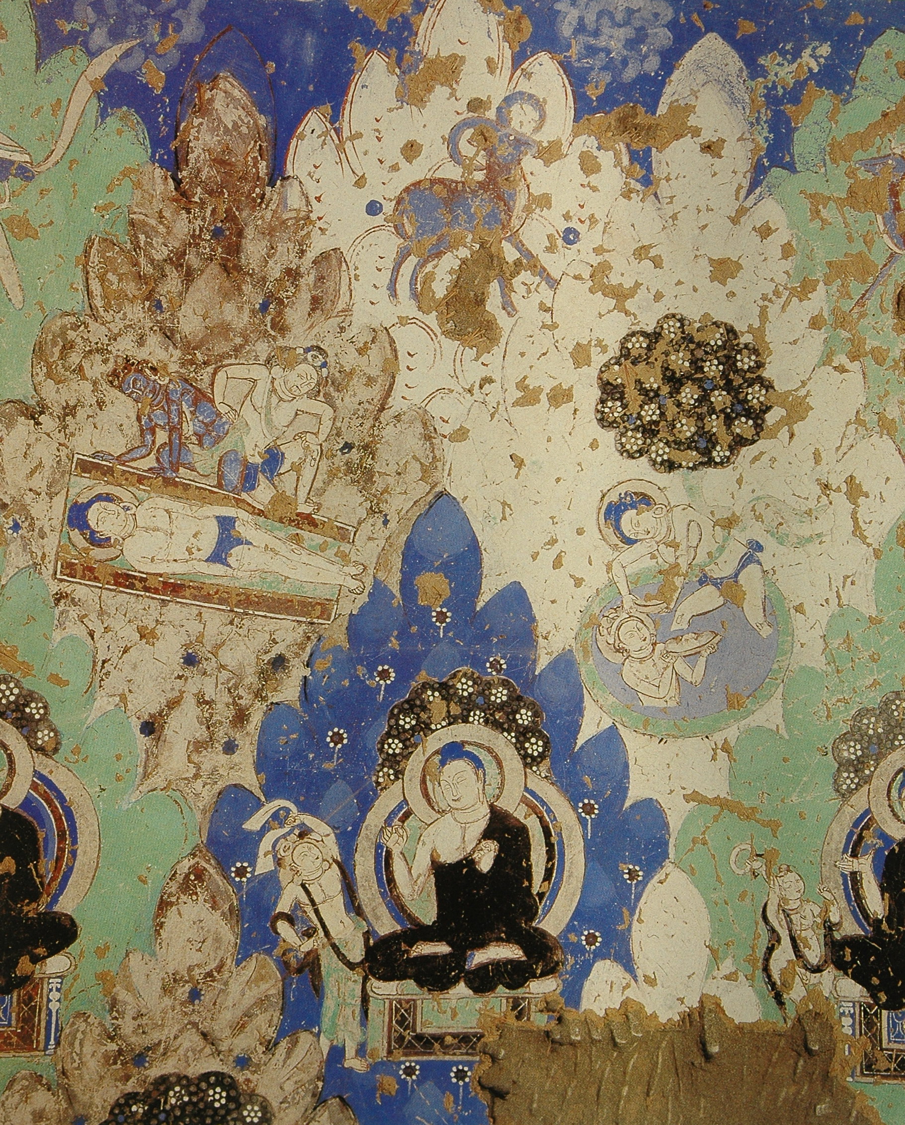 表现释迦入灭的涅槃图像,最初出现于犍陀罗,后来经过中亚沿丝绸之路传入中国新疆。在犍陀罗表现与涅槃有关的各个场面中,最重视的是释迦涅槃场面。犍陀罗地区出现的涅槃图,是这一图像最古老的样式,其主要特征是:娑罗双树下,佛陀右胁而卧。如出土于的罗里延-唐盖(Loriyan Tangai)的涅槃图像浮雕,为二至三世纪的作品,现藏印度加尔各答博物馆,除了卧佛之外,还包括了悲泣痛哭的人物二十余身。又如出土于塔克依-贝依(Takhi Behi),现藏于白沙瓦博物馆的佛传浮雕原是一块雕刻在佛塔或寺院石碑上的浮雕,石碑的中央部分分成五格,自上而下,最下格即饰有涅槃像,在娑罗双树下,佛陀右胁而卧,在佛陀的足边围着伤心欲绝的徒众们,一位手执锡杖的尊者──迦叶尊者,他并未赶上见佛陀最后的一面,而是闻声赶来奔丧。这类涅槃像是属于佛传故事的一部分,而非单独的涅槃像。法国学者福歇(A. Foucher)在对这一犍陀罗图像分析研究的基础上,确定了涅槃图像的古典图式,日本学者宫治昭则指出了犍陀罗地区这一图像所用的经典均为小乘派系的涅槃经。现存的犍陀罗涅槃图作品广为人知的就有七十多件,全部为浮雕。尽管这些作品呈现出诸多变化,但其基本表现结构是一致的:在横长图像构图上面两端配置娑罗双树,构图中心为宽大的寝台,释迦侧卧于上,周围点缀着涅槃经中记述的一些故事情节和无限悲伤的僧俗、诸神等。娑罗树常见于喜马拉雅山麓到印度全境,是一种半落叶且高大的乔木,每年三月前后开白色小花。巴利文佛经注释这样解释娑罗树说:两棵娑罗树根干枝叶纠缠在一起,宛如一棵大树,在犍陀罗的涅槃图中,释迦的枕边和足端各有一棵,表现的就是双娑罗树,而有时会在背景上绘有三棵以上娑罗树,代表着佛经中所说的“娑罗林”“娑罗园”。