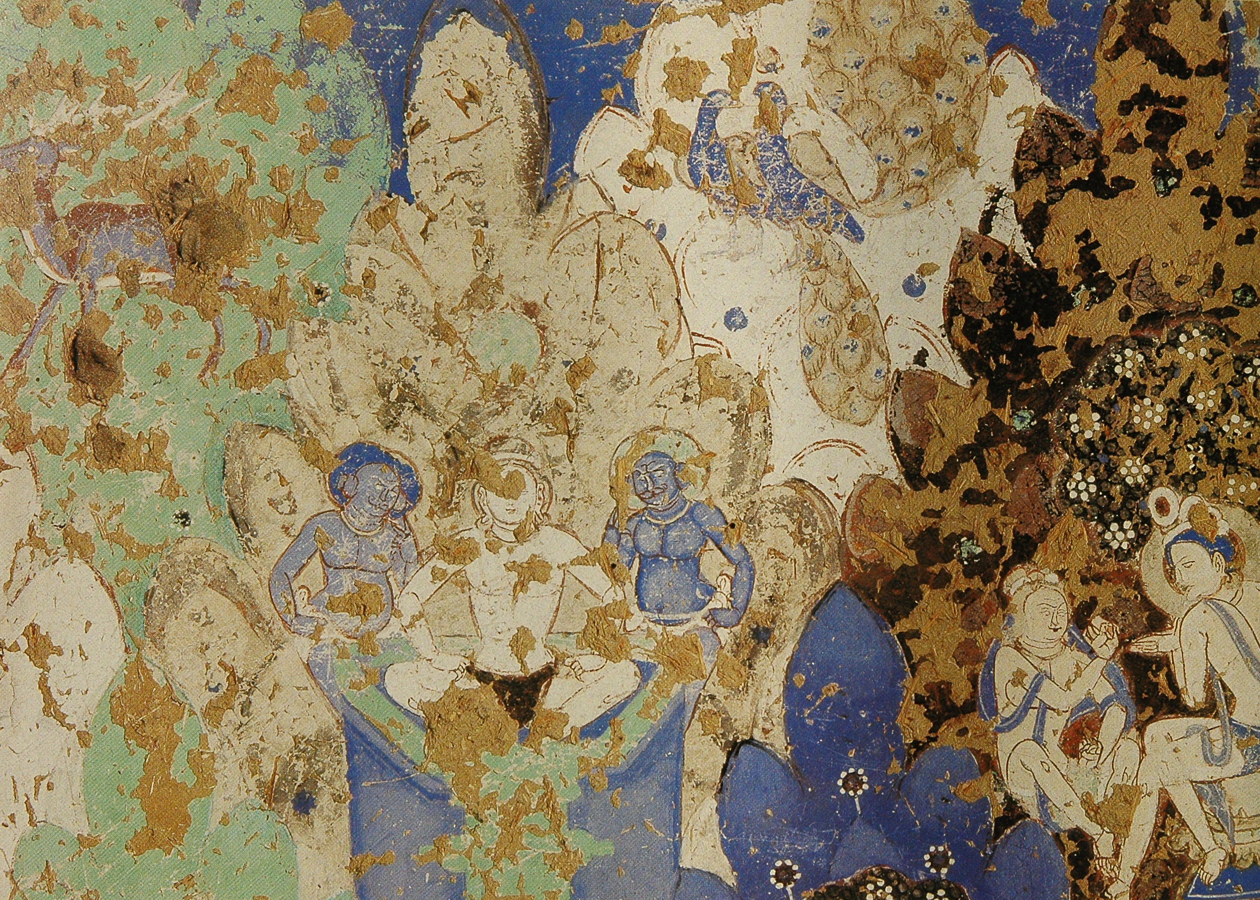 表现释迦入灭的涅槃图像,最初出现于犍陀罗,后来经过中亚沿丝绸之路传入中国新疆。在犍陀罗表现与涅槃有关的各个场面中,最重视的是释迦涅槃场面。犍陀罗地区出现的涅槃图,是这一图像最古老的样式,其主要特征是:娑罗双树下,佛陀右胁而卧。如出土于的罗里延-唐盖(Loriyan Tangai)的涅槃图像浮雕,为二至三世纪的作品,现藏印度加尔各答博物馆,除了卧佛之外,还包括了悲泣痛哭的人物二十余身。又如出土于塔克依-贝依(Takhi Behi),现藏于白沙瓦博物馆的佛传浮雕原是一块雕刻在佛塔或寺院石碑上的浮雕,石碑的中央部分分成五格,自上而下,最下格即饰有涅槃像,在娑罗双树下,佛陀右胁而卧,在佛陀的足边围着伤心欲绝的徒众们,一位手执锡杖的尊者──迦叶尊者,他并未赶上见佛陀最后的一面,而是闻声赶来奔丧。这类涅槃像是属于佛传故事的一部分,而非单独的涅槃像。法国学者福歇(A. Foucher)在对这一犍陀罗图像分析研究的基础上,确定了涅槃图像的古典图式,日本学者宫治昭则指出了犍陀罗地区这一图像所用的经典均为小乘派系的涅槃经。现存的犍陀罗涅槃图作品广为人知的就有七十多件,全部为浮雕。尽管这些作品呈现出诸多变化,但其基本表现结构是一致的:在横长图像构图上面两端配置娑罗双树,构图中心为宽大的寝台,释迦侧卧于上,周围点缀着涅槃经中记述的一些故事情节和无限悲伤的僧俗、诸神等。娑罗树常见于喜马拉雅山麓到印度全境,是一种半落叶且高大的乔木,每年三月前后开白色小花。巴利文佛经注释这样解释娑罗树说:两棵娑罗树根干枝叶纠缠在一起,宛如一棵大树,在犍陀罗的涅槃图中,释迦的枕边和足端各有一棵,表现的就是双娑罗树,而有时会在背景上绘有三棵以上娑罗树,代表着佛经中所说的“娑罗林”“娑罗园”。