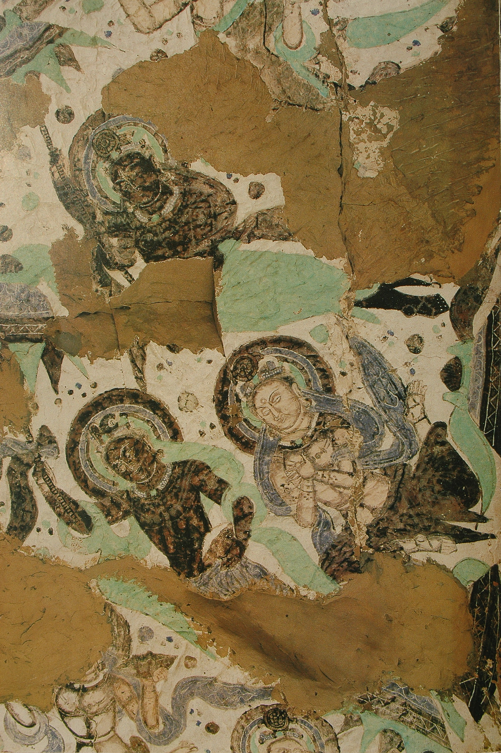 表现释迦入灭的涅槃图像,最初出现于犍陀罗,后来经过中亚沿丝绸之路传入中国新疆。在犍陀罗表现与涅槃有关的各个场面中,最重视的是释迦涅槃场面。犍陀罗地区出现的涅槃图,是这一图像最古老的样式,其主要特征是:娑罗双树下,佛陀右胁而卧。如出土于的罗里延-唐盖(Loriyan Tangai)的涅槃图像浮雕,为二至三世纪的作品,现藏印度加尔各答博物馆,除了卧佛之外,还包括了悲泣痛哭的人物二十余身。又如出土于塔克依-贝依(Takhi Behi),现藏于白沙瓦博物馆的佛传浮雕原是一块雕刻在佛塔或寺院石碑上的浮雕,石碑的中央部分分成五格,自上而下,最下格即饰有涅槃像,在娑罗双树下,佛陀右胁而卧,在佛陀的足边围着伤心欲绝的徒众们,一位手执锡杖的尊者──迦叶尊者,他并未赶上见佛陀最后的一面,而是闻声赶来奔丧。这类涅槃像是属于佛传故事的一部分,而非单独的涅槃像。法国学者福歇(A. Foucher)在对这一犍陀罗图像分析研究的基础上,确定了涅槃图像的古典图式,日本学者宫治昭则指出了犍陀罗地区这一图像所用的经典均为小乘派系的涅槃经。现存的犍陀罗涅槃图作品广为人知的就有七十多件,全部为浮雕。尽管这些作品呈现出诸多变化,但其基本表现结构是一致的:在横长图像构图上面两端配置娑罗双树,构图中心为宽大的寝台,释迦侧卧于上,周围点缀着涅槃经中记述的一些故事情节和无限悲伤的僧俗、诸神等。娑罗树常见于喜马拉雅山麓到印度全境,是一种半落叶且高大的乔木,每年三月前后开白色小花。巴利文佛经注释这样解释娑罗树说:两棵娑罗树根干枝叶纠缠在一起,宛如一棵大树,在犍陀罗的涅槃图中,释迦的枕边和足端各有一棵,表现的就是双娑罗树,而有时会在背景上绘有三棵以上娑罗树,代表着佛经中所说的“娑罗林”“娑罗园”。