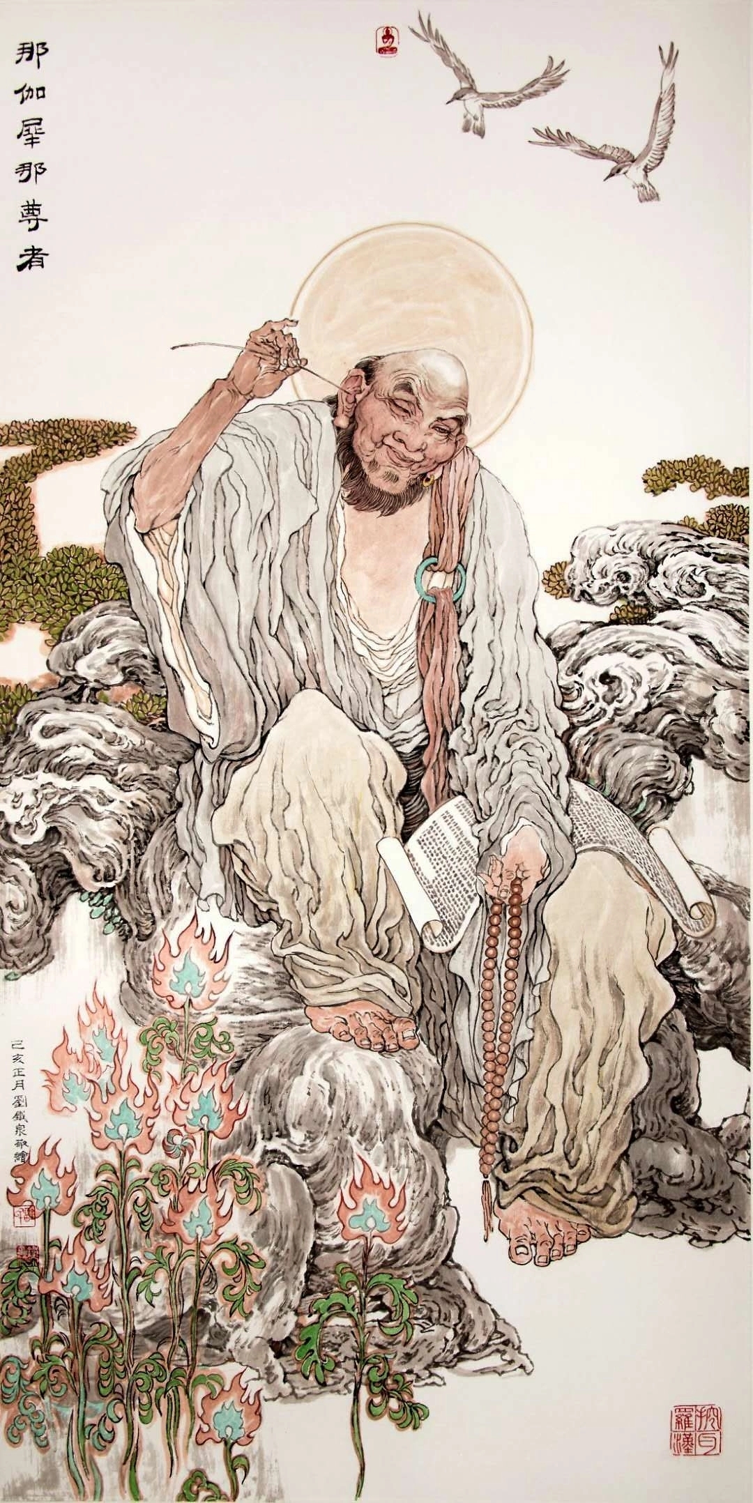 十八罗汉第十二位,俗称挖耳罗汉,又作罗迦那、纳阿噶塞纳等。那伽犀那二十岁受具足戒,后修证阿罗汉果。他曾到古印度西北舍竭国,拜见国王弥兰陀,应国王询问,以各种比喻广泛说明人生无常,善恶报应等佛法,以及佛教徒修行等重大问题。深入浅出,对答如流,其所有问答都载于佛教经典《那先比丘经》里。那伽犀那因论《耳根》而名闻印度。所谓耳根,是由醒觉而生认识,是人类认识世界的六种根源之一。所谓六根清净,耳根清净是其中之一。佛教中除不听各种淫邪声音之外,更不可听别人的秘密。因那伽犀那论耳根最到家,故取挖耳之形,以示耳根清净。他率一千二百阿罗汉住半度波山。