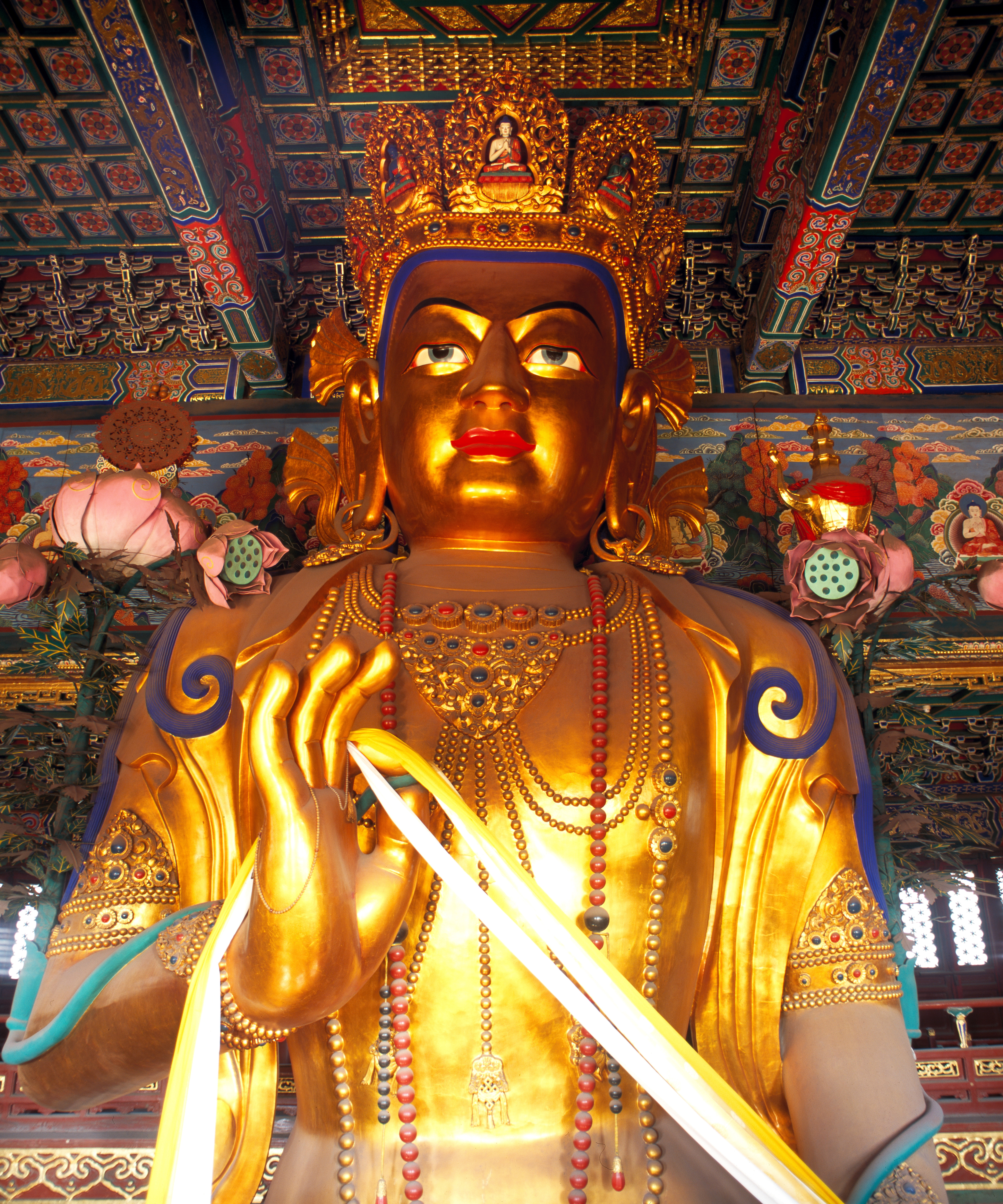 万福阁内的主供佛为弥勒大佛,藏俗称“强巴佛”,蒙古语叫“迈达拉佛”。据《净名流》中记载“弥勒菩萨”是一历史人物,生于印度婆罗门家庭,后从释迦牟尼出家,成为佛弟子,先佛入灭。上生于兜率天内院,经四千岁当下生人间,于华林园龙华树下成佛,广传佛法。因此,佛教称他为未来佛。这尊大佛像于1990年被载入吉尼斯世界大全,被誉为木雕大佛的世界之最。
