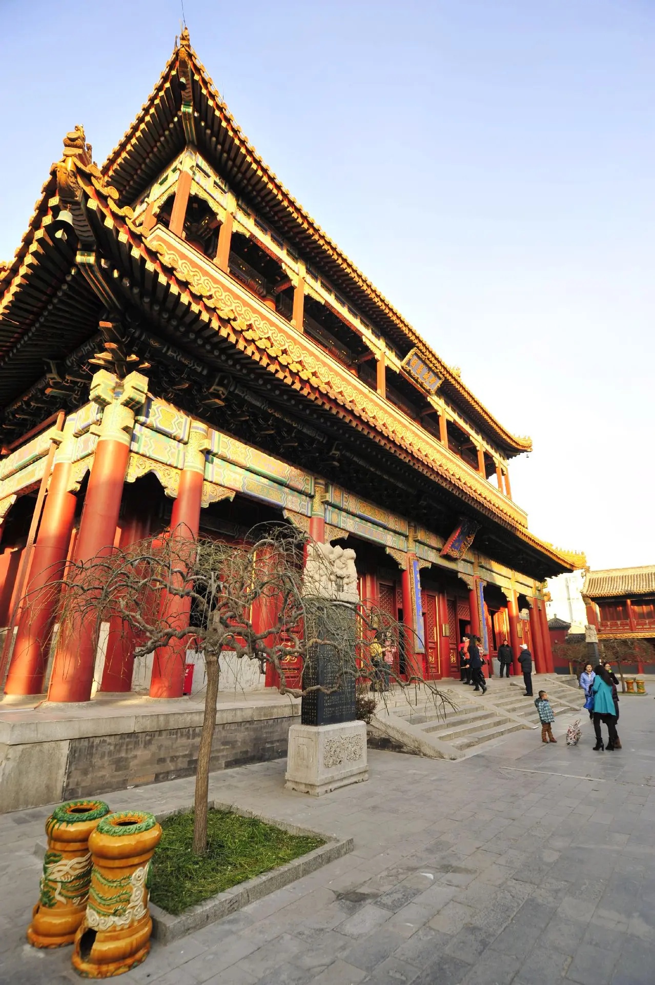 五朝故都北京,到处都散落着旧都遗迹,在北二环东北角内侧,就并列着三组规模庞大的古建筑群。西面那组,覆盖着标志中国封建社会等级最高的黄色琉璃瓦,基高殿大、规制整齐,那是元、明、清三朝中央最高学府国子监和祭祀孔夫子的场所孔庙。东面那组灰瓦红墙、格局严谨,则为元、明、清三朝京师“八大寺院”之一的柏林寺。在两者之间,坐落着另一组与之风格迥异、巍峨壮观的古建筑群,在一片土灰基色之中,格外凸显其辉煌庄严的皇家气势,这里就是清代朝廷首寺——雍和宫。