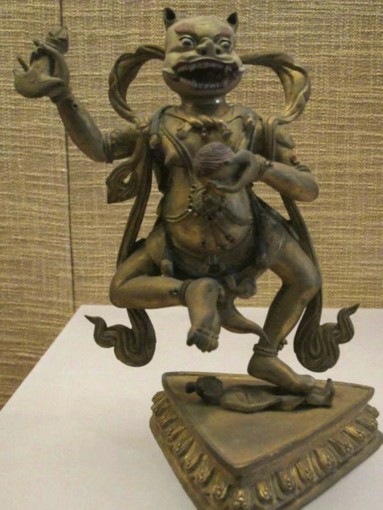 俗称铜打胎,即以薄铜板锤打而成。时轮殿内的时轮金刚双身像即是锤磔像中的精品。此像高210厘米,乾隆年造。其头有四面,身具二十四臂,削肩细腰,造型多有西藏地区特点。