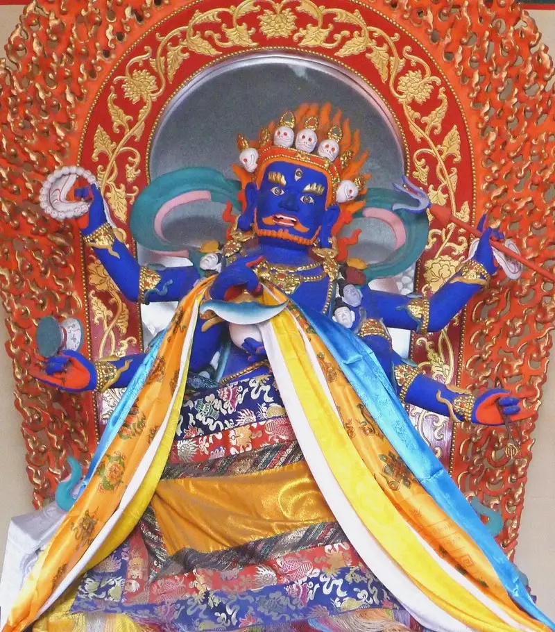 从北往南第二尊是六臂勇保护法像,他被列为藏传佛教密宗护法神之首。梵文名为:摩诃迦罗,藏地区称棍布,蒙语则称:玛哈嘎拉。此像为一面六臂,头戴五髑髅冠,足踏一匹仰卧的白象身上。此像为典型的“忿怒相”,六只手臂象征修法中的六解脱,手中法器则分别代表:克烦恼,断俗念,增智慧,去邪恶等含义。此护法主要的功德是庇护众生,解脱大众的困苦烦恼,圆满众生的一切善愿,所以藏地都视他为施福之神,家家供奉。
