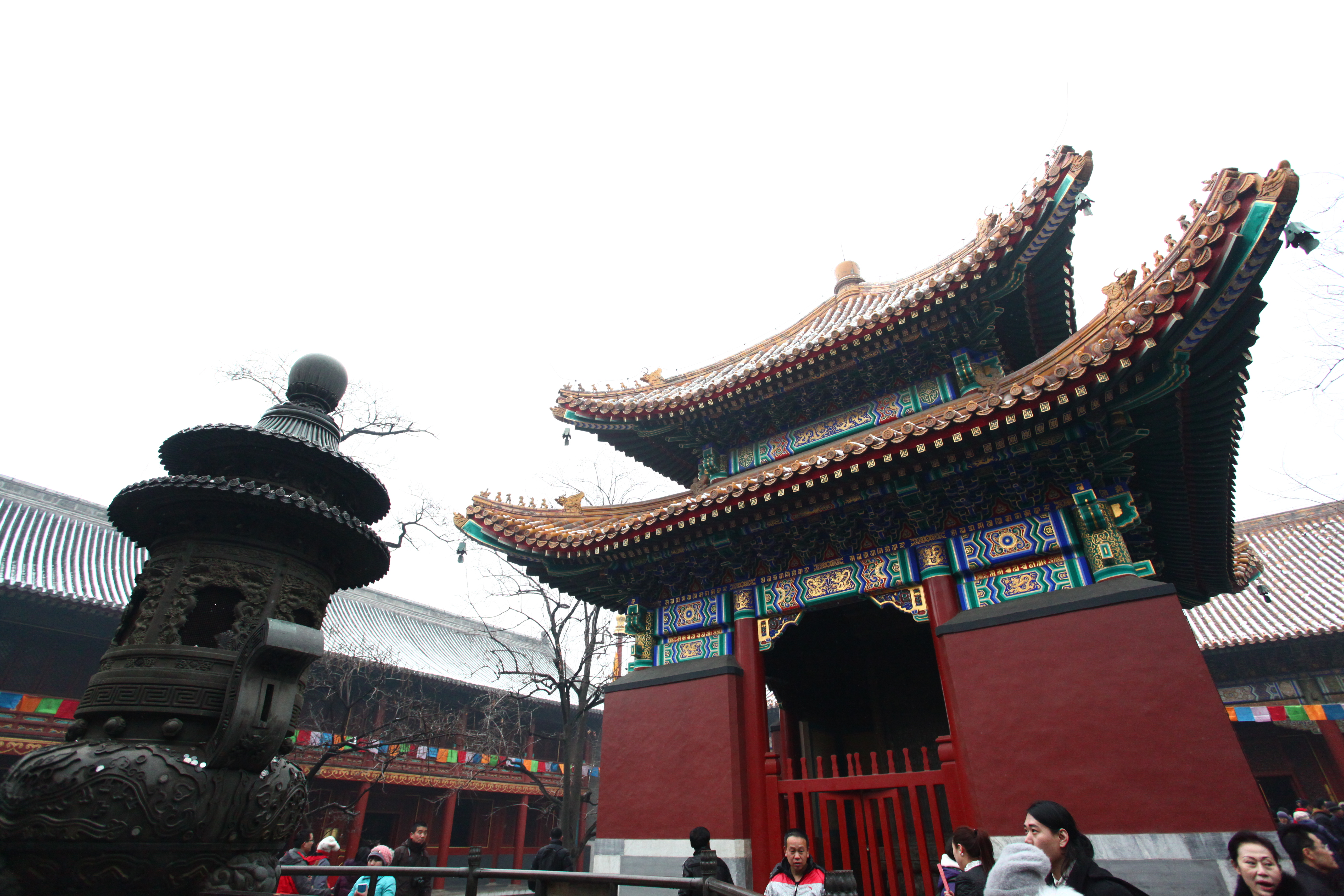 五朝故都北京,到处都散落着旧都遗迹,在北二环东北角内侧,就并列着三组规模庞大的古建筑群。西面那组,覆盖着标志中国封建社会等级最高的黄色琉璃瓦,基高殿大、规制整齐,那是元、明、清三朝中央最高学府国子监和祭祀孔夫子的场所孔庙。东面那组灰瓦红墙、格局严谨,则为元、明、清三朝京师“八大寺院”之一的柏林寺。在两者之间,坐落着另一组与之风格迥异、巍峨壮观的古建筑群,在一片土灰基色之中,格外凸显其辉煌庄严的皇家气势,这里就是清代朝廷首寺——雍和宫。