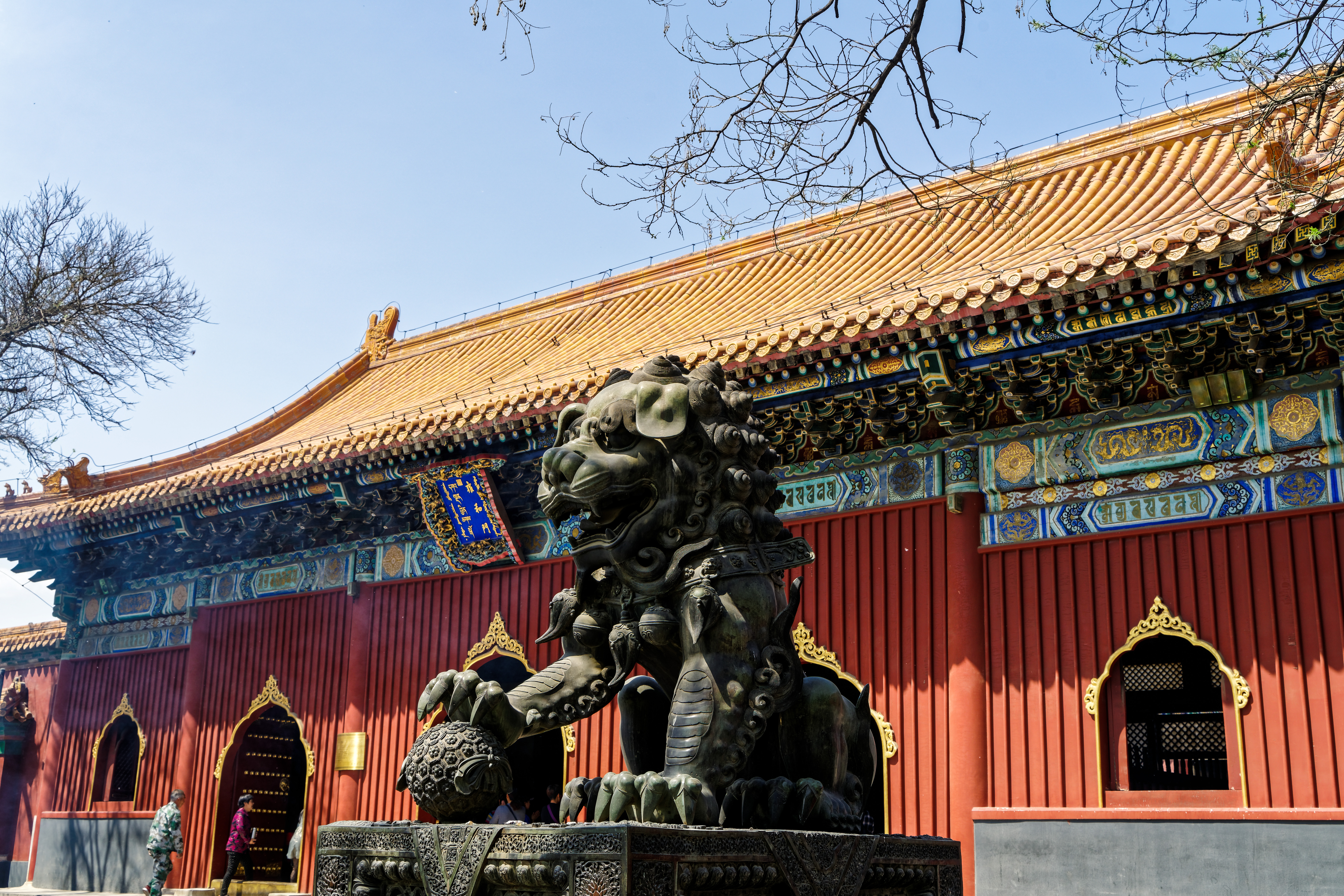 五朝故都北京,到处都散落着旧都遗迹,在北二环东北角内侧,就并列着三组规模庞大的古建筑群。西面那组,覆盖着标志中国封建社会等级最高的黄色琉璃瓦,基高殿大、规制整齐,那是元、明、清三朝中央最高学府国子监和祭祀孔夫子的场所孔庙。东面那组灰瓦红墙、格局严谨,则为元、明、清三朝京师“八大寺院”之一的柏林寺。在两者之间,坐落着另一组与之风格迥异、巍峨壮观的古建筑群,在一片土灰基色之中,格外凸显其辉煌庄严的皇家气势,这里就是清代朝廷首寺——雍和宫。