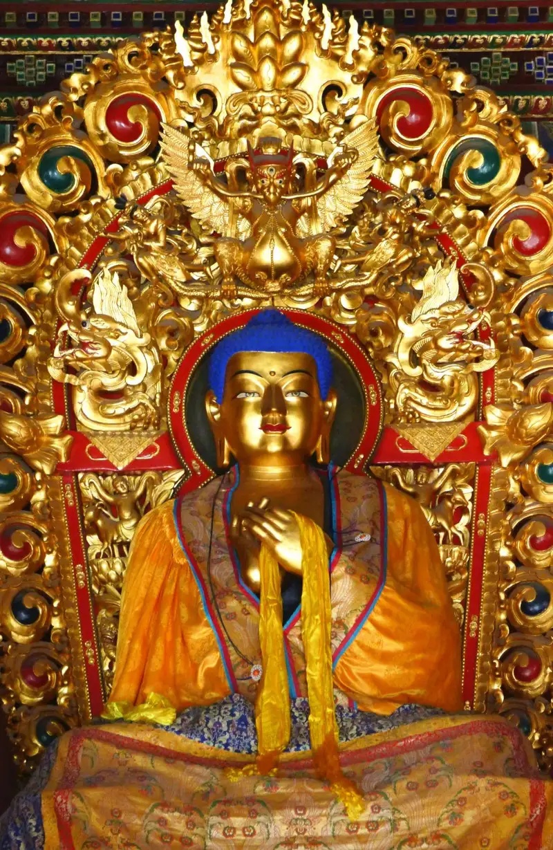 殿内主供“燃灯”、“释迦”、“弥勒”,总称三世佛。位于中间的释迦牟尼佛,是三世佛的“现在佛”,又叫“现在当世佛”,是佛教的创始人。“释迦”是种族名,意为“能”;“牟尼”意为“仁”、“儒”。释迦牟尼是信徒对他的尊称,意为“释迦族的圣人”。相传他是古印度北部迦毗罗卫国(今尼泊尔南部)净饭王的太子,名“悉达多·乔达摩”。幼年时受传统的婆罗门教育,29岁时有感于人生、老、病、死各种苦恼,又对当时婆罗门教不满,舍弃王族生活,出家修道,创建了佛教,是当时反婆罗门教思潮之一。基本教义是,把现实人生断定为“无常”、“无我”、“苦”,认为其原因既不在超现实的梵天,也不在社会环境,而由每人自身的“惑”、“业”所致。“惑”指贪、痴等烦恼;“业”指身、口、意等活动。“或”、“业”为因,造成生死不息之果;根据善恶行为轮回报应,故摆脱痛苦之路,惟有依经,律、论三藏,修持戒、定、慧三学,彻底转变自己的世俗欲望和认识,超出生死轮回范围,达到这种最高目标,叫做“涅槃”或“解脱”。他反对“婆罗门第一”,主张“四姓平等”。
