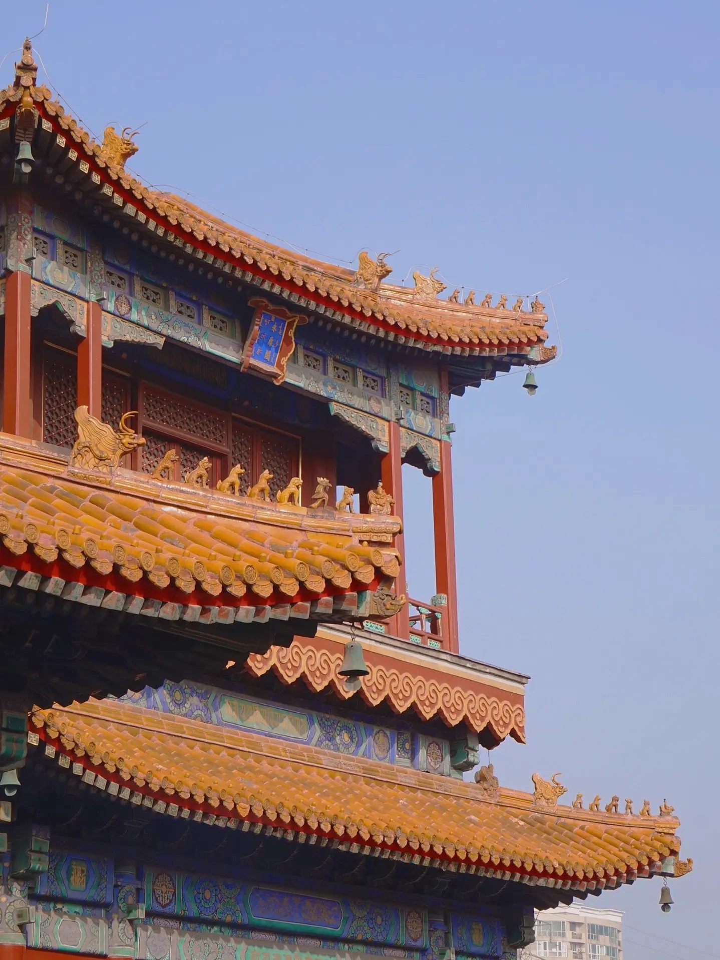 五朝故都北京,到处都散落着旧都遗迹,在北二环东北角内侧,就并列着三组规模庞大的古建筑群。西面那组,覆盖着标志中国封建社会等级最高的黄色琉璃瓦,基高殿大、规制整齐,那是元、明、清三朝中央最高学府国子监和祭祀孔夫子的场所孔庙。东面那组灰瓦红墙、格局严谨,则为元、明、清三朝京师“八大寺院”之一的柏林寺。在两者之间,坐落着另一组与之风格迥异、巍峨壮观的古建筑群,在一片土灰基色之中,格外凸显其辉煌庄严的皇家气势,这里就是清代朝廷首寺——雍和宫。