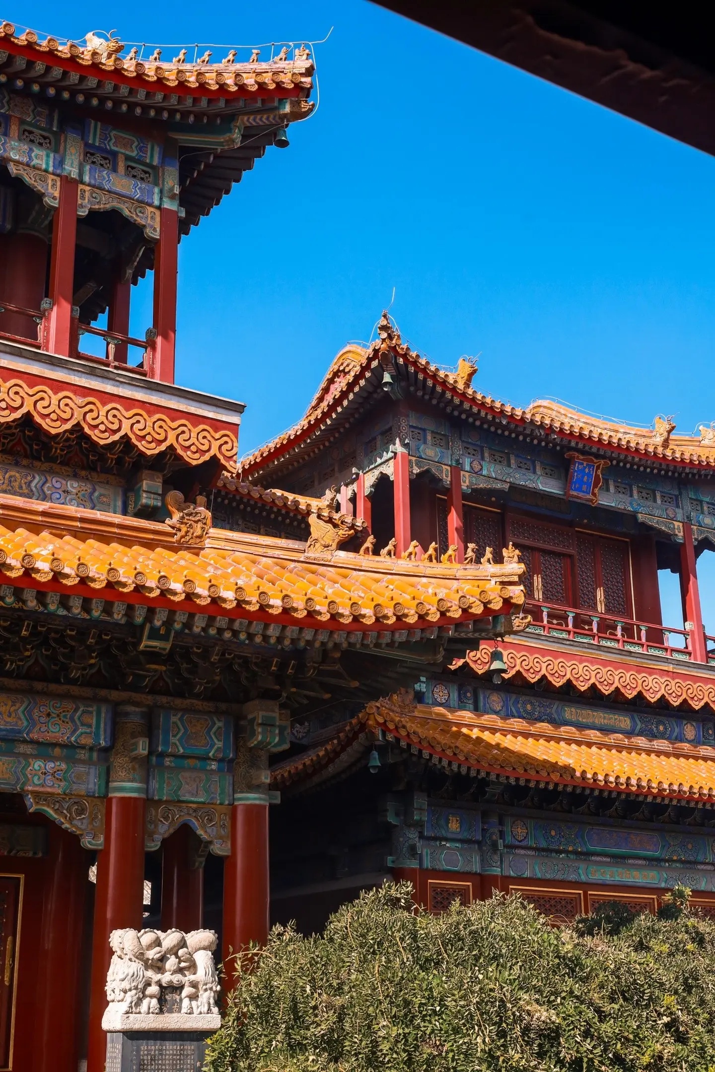 五朝故都北京,到处都散落着旧都遗迹,在北二环东北角内侧,就并列着三组规模庞大的古建筑群。西面那组,覆盖着标志中国封建社会等级最高的黄色琉璃瓦,基高殿大、规制整齐,那是元、明、清三朝中央最高学府国子监和祭祀孔夫子的场所孔庙。东面那组灰瓦红墙、格局严谨,则为元、明、清三朝京师“八大寺院”之一的柏林寺。在两者之间,坐落着另一组与之风格迥异、巍峨壮观的古建筑群,在一片土灰基色之中,格外凸显其辉煌庄严的皇家气势,这里就是清代朝廷首寺——雍和宫。