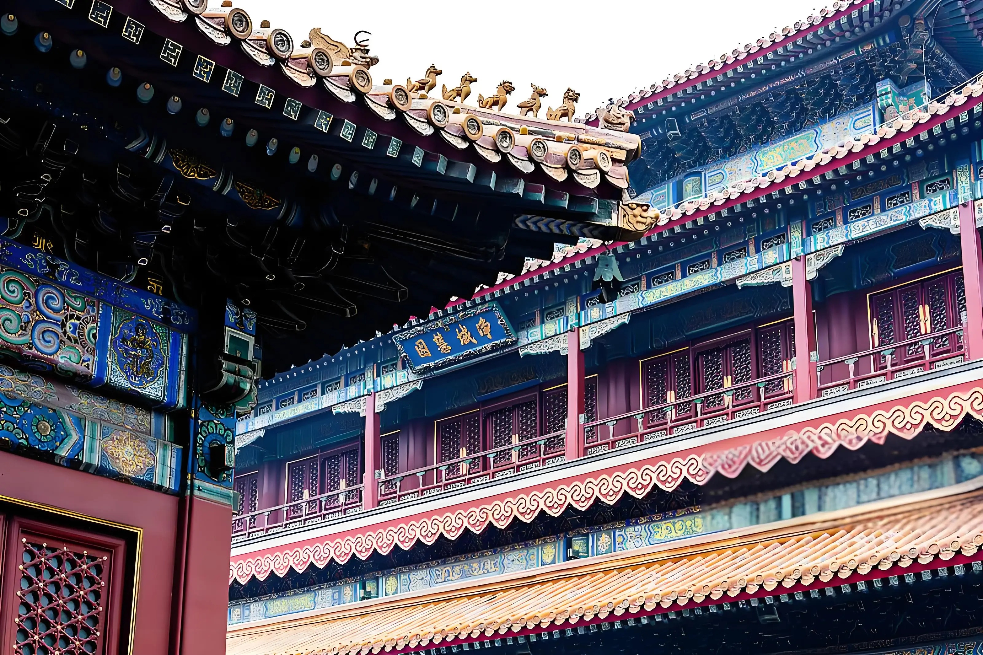 五朝故都北京,到处都散落着旧都遗迹,在北二环东北角内侧,就并列着三组规模庞大的古建筑群。西面那组,覆盖着标志中国封建社会等级最高的黄色琉璃瓦,基高殿大、规制整齐,那是元、明、清三朝中央最高学府国子监和祭祀孔夫子的场所孔庙。东面那组灰瓦红墙、格局严谨,则为元、明、清三朝京师“八大寺院”之一的柏林寺。在两者之间,坐落着另一组与之风格迥异、巍峨壮观的古建筑群,在一片土灰基色之中,格外凸显其辉煌庄严的皇家气势,这里就是清代朝廷首寺——雍和宫。