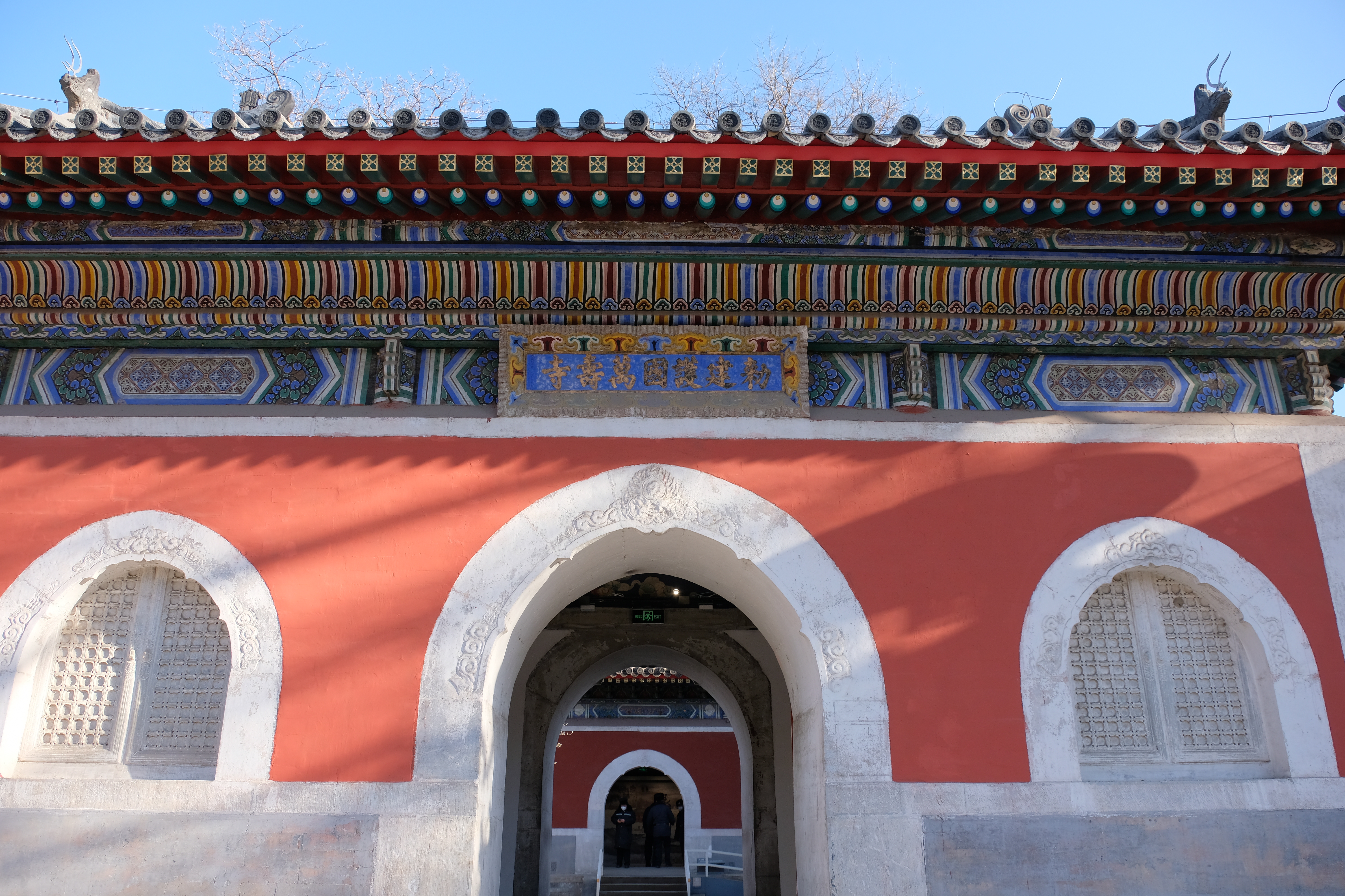 万寿寺山门,山门始建于明万历五年(1577),砖石结构,单檐歇山顶,中间为石雕穿堂券门,两侧有券式假窗。殿门上方悬挂顺治帝赐“敕建护国万寿寺”匾额,署“大清顺治二年岁次己酉季夏立”款。殿两侧是卡子墙和影壁,影壁为撇山一封书式,壁身的四个岔角内饰宝相花。影壁座为青白石雕须弥座,与卡子墙基座相连。殿内两侧原有泥塑金刚力士像,今无存。