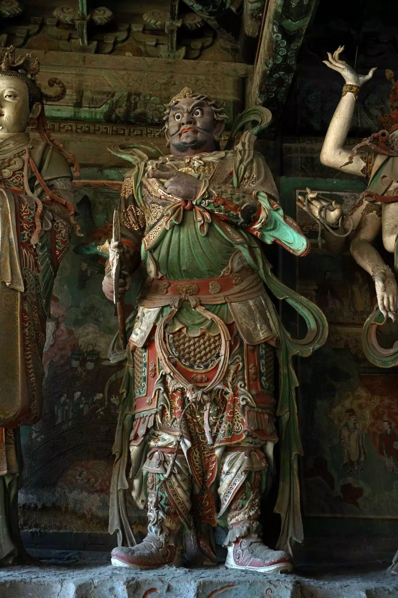在初步认定28尊彩色塑像名号的过程中,发现其组合排列及群体布局的构成,构思周密。不仅如此,在那缜密的思考中还注入了宗教宣传的功利意图。比如,是将帝后、文官武将、容貌修好的世俗裙钗、面目狰狞的神话人物穿插排列,使一字排开的众多塑像个体,在形式感上有着动静、收放、文野于服饰华丽或简约的对比变化,一方面减弱了所有塑像都以端正严肃的站立姿势,平均排列在须弥座上,把可能产生的呆板、单调的排列变成为有节奏变化的构成。