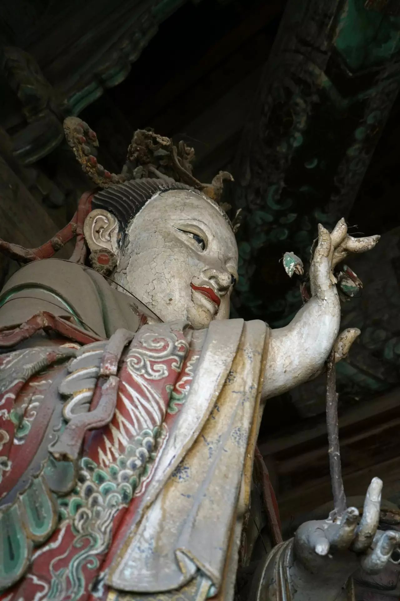 在初步认定28尊彩色塑像名号的过程中,发现其组合排列及群体布局的构成,构思周密。不仅如此,在那缜密的思考中还注入了宗教宣传的功利意图。比如,是将帝后、文官武将、容貌修好的世俗裙钗、面目狰狞的神话人物穿插排列,使一字排开的众多塑像个体,在形式感上有着动静、收放、文野于服饰华丽或简约的对比变化,一方面减弱了所有塑像都以端正严肃的站立姿势,平均排列在须弥座上,把可能产生的呆板、单调的排列变成为有节奏变化的构成。