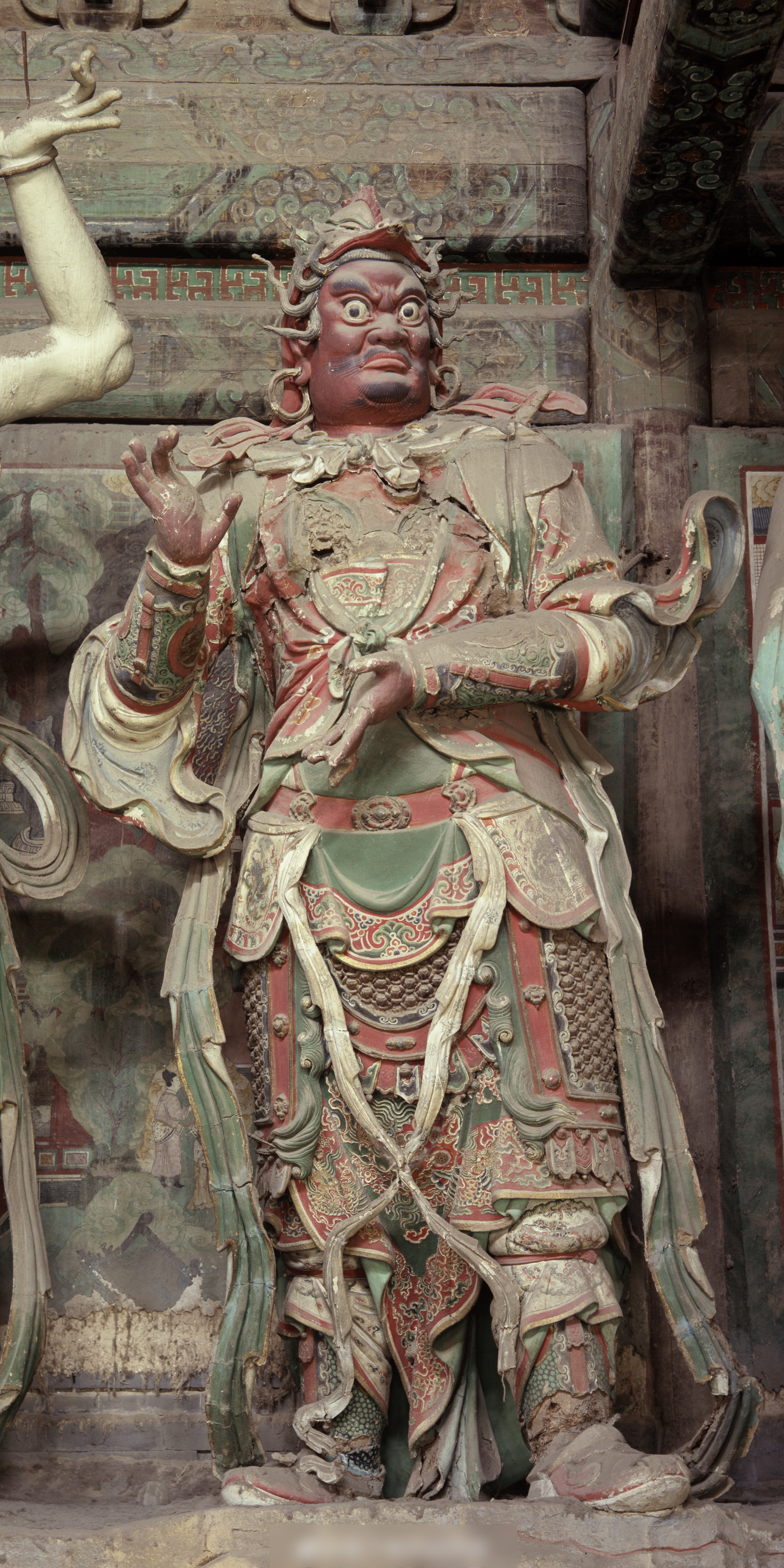 同时,又使一尊尊单体塑像在形式美感上有了内在联系,使众多高大塑像形成气势雄伟的群像阵容。而且还具有另外一种特征即精湛的彩绘。“塑容绘质”是中国传统雕塑的一大特色,无论是石刻造像还是泥塑造像,最后往往以着彩形式完成,彩绘在增强雕塑作品的表现力方面发挥了其他不可代替的作用。28尊彩色塑像的色彩、装銮浓重,以朱砂、黄丹、雄黄等矿物质原料为主,大量参用赤金、白银,形成富丽辉煌、金彩璀璨的艺术效果。另外,“开脸”的成功不可低估,28尊彩色塑像尊尊个性鲜明的性格和生动丰富的表情,在很大程度上是通过面部形象充分揭示的。形态生动逼真,充分显示了明代彩塑的艺术魅力。