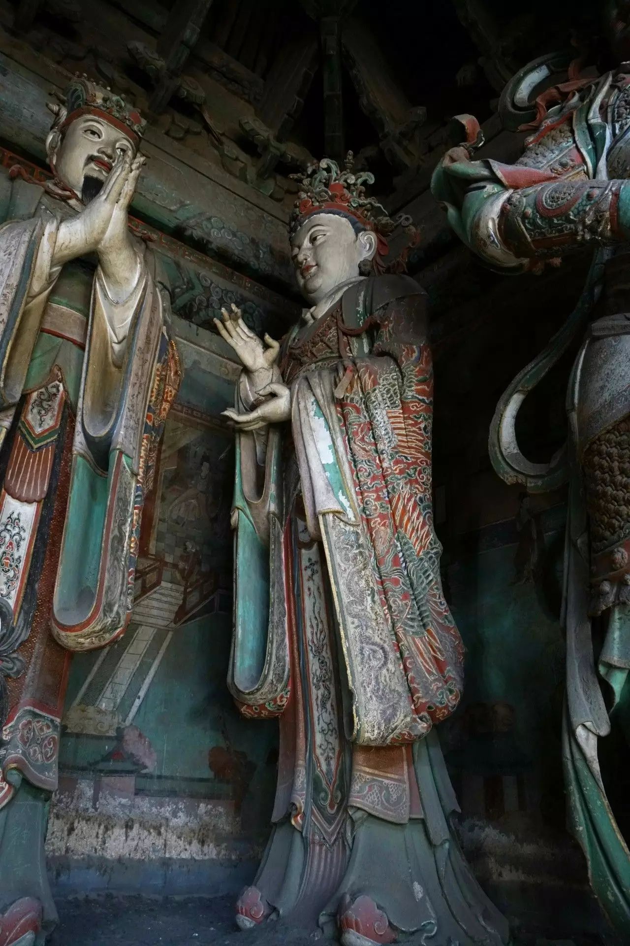 在初步认定28尊彩色塑像名号的过程中,发现其组合排列及群体布局的构成,构思周密。不仅如此,在那缜密的思考中还注入了宗教宣传的功利意图。比如,是将帝后、文官武将、容貌修好的世俗裙钗、面目狰狞的神话人物穿插排列,使一字排开的众多塑像个体,在形式感上有着动静、收放、文野于服饰华丽或简约的对比变化,一方面减弱了所有塑像都以端正严肃的站立姿势,平均排列在须弥座上,把可能产生的呆板、单调的排列变成为有节奏变化的构成。