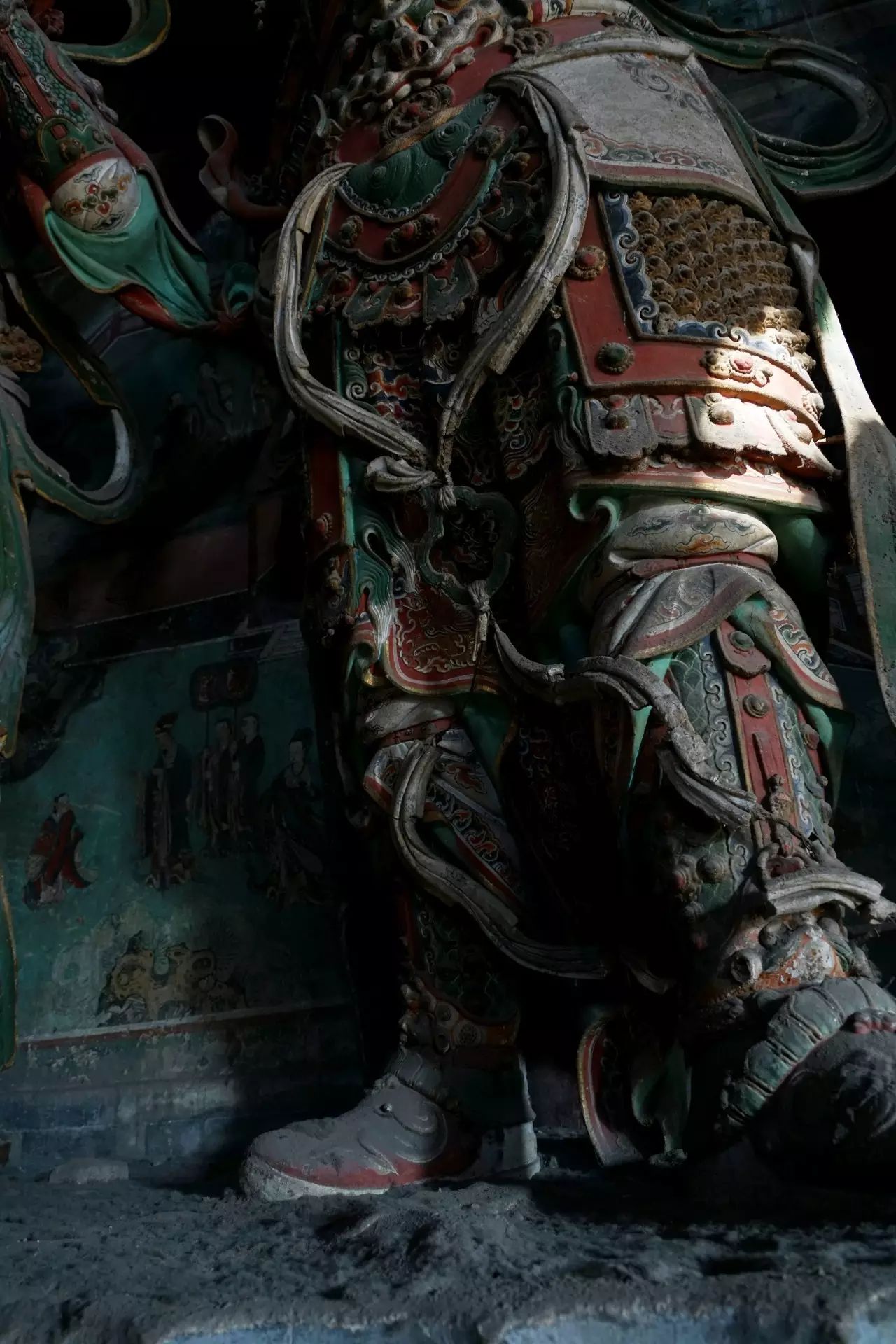 在初步认定28尊彩色塑像名号的过程中,发现其组合排列及群体布局的构成,构思周密。不仅如此,在那缜密的思考中还注入了宗教宣传的功利意图。比如,是将帝后、文官武将、容貌修好的世俗裙钗、面目狰狞的神话人物穿插排列,使一字排开的众多塑像个体,在形式感上有着动静、收放、文野于服饰华丽或简约的对比变化,一方面减弱了所有塑像都以端正严肃的站立姿势,平均排列在须弥座上,把可能产生的呆板、单调的排列变成为有节奏变化的构成。