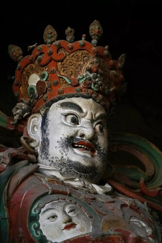 同时,又使一尊尊单体塑像在形式美感上有了内在联系,使众多高大塑像形成气势雄伟的群像阵容。而且还具有另外一种特征即精湛的彩绘。“塑容绘质”是中国传统雕塑的一大特色,无论是石刻造像还是泥塑造像,最后往往以着彩形式完成,彩绘在增强雕塑作品的表现力方面发挥了其他不可代替的作用。28尊彩色塑像的色彩、装銮浓重,以朱砂、黄丹、雄黄等矿物质原料为主,大量参用赤金、白银,形成富丽辉煌、金彩璀璨的艺术效果。另外,“开脸”的成功不可低估,28尊彩色塑像尊尊个性鲜明的性格和生动丰富的表情,在很大程度上是通过面部形象充分揭示的。形态生动逼真,充分显示了明代彩塑的艺术魅力。