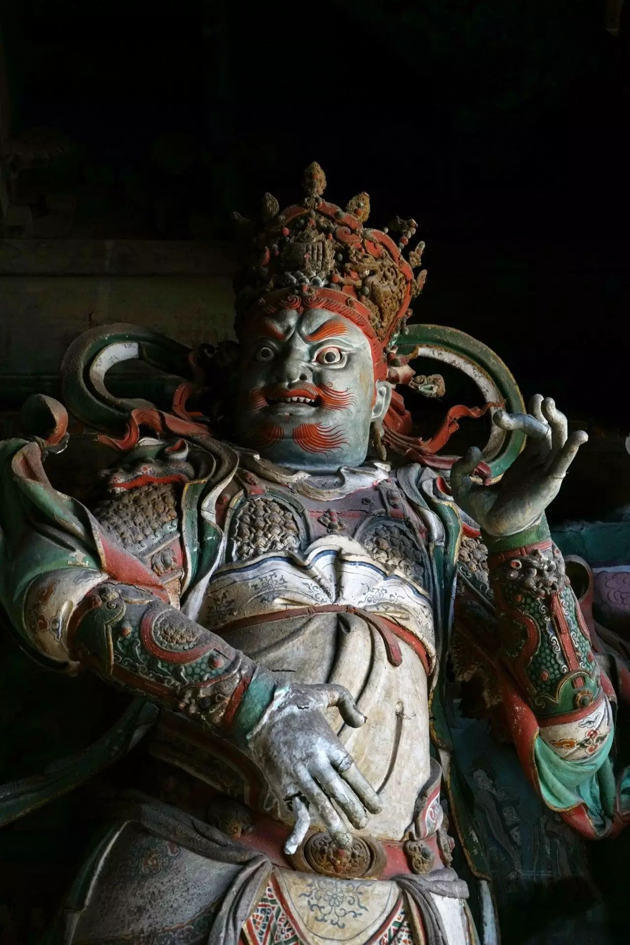 同时,又使一尊尊单体塑像在形式美感上有了内在联系,使众多高大塑像形成气势雄伟的群像阵容。而且还具有另外一种特征即精湛的彩绘。“塑容绘质”是中国传统雕塑的一大特色,无论是石刻造像还是泥塑造像,最后往往以着彩形式完成,彩绘在增强雕塑作品的表现力方面发挥了其他不可代替的作用。28尊彩色塑像的色彩、装銮浓重,以朱砂、黄丹、雄黄等矿物质原料为主,大量参用赤金、白银,形成富丽辉煌、金彩璀璨的艺术效果。另外,“开脸”的成功不可低估,28尊彩色塑像尊尊个性鲜明的性格和生动丰富的表情,在很大程度上是通过面部形象充分揭示的。形态生动逼真,充分显示了明代彩塑的艺术魅力。