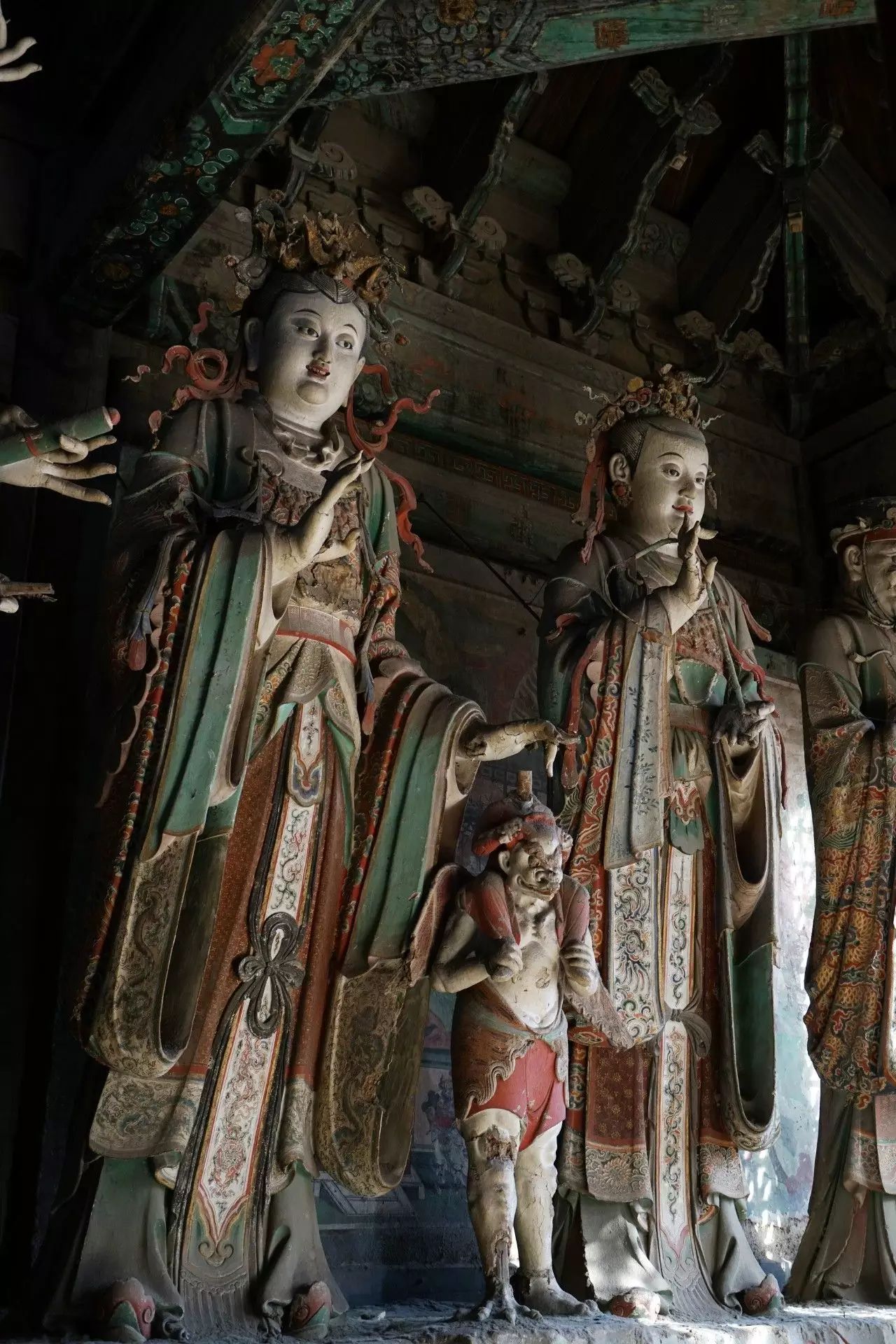 在初步认定28尊彩色塑像名号的过程中,发现其组合排列及群体布局的构成,构思周密。不仅如此,在那缜密的思考中还注入了宗教宣传的功利意图。比如,是将帝后、文官武将、容貌修好的世俗裙钗、面目狰狞的神话人物穿插排列,使一字排开的众多塑像个体,在形式感上有着动静、收放、文野于服饰华丽或简约的对比变化,一方面减弱了所有塑像都以端正严肃的站立姿势,平均排列在须弥座上,把可能产生的呆板、单调的排列变成为有节奏变化的构成。