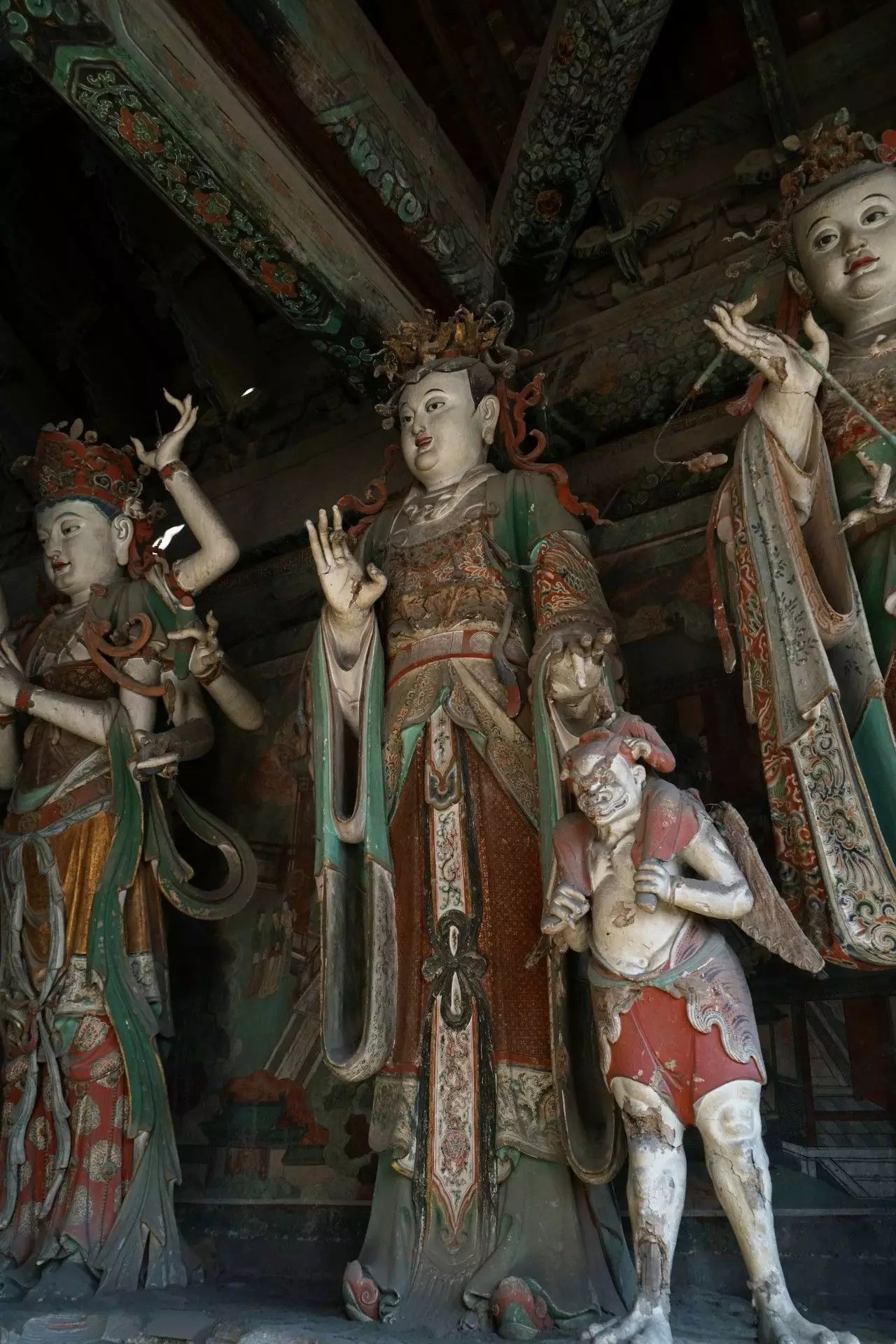 在初步认定28尊彩色塑像名号的过程中,发现其组合排列及群体布局的构成,构思周密。不仅如此,在那缜密的思考中还注入了宗教宣传的功利意图。比如,是将帝后、文官武将、容貌修好的世俗裙钗、面目狰狞的神话人物穿插排列,使一字排开的众多塑像个体,在形式感上有着动静、收放、文野于服饰华丽或简约的对比变化,一方面减弱了所有塑像都以端正严肃的站立姿势,平均排列在须弥座上,把可能产生的呆板、单调的排列变成为有节奏变化的构成。
