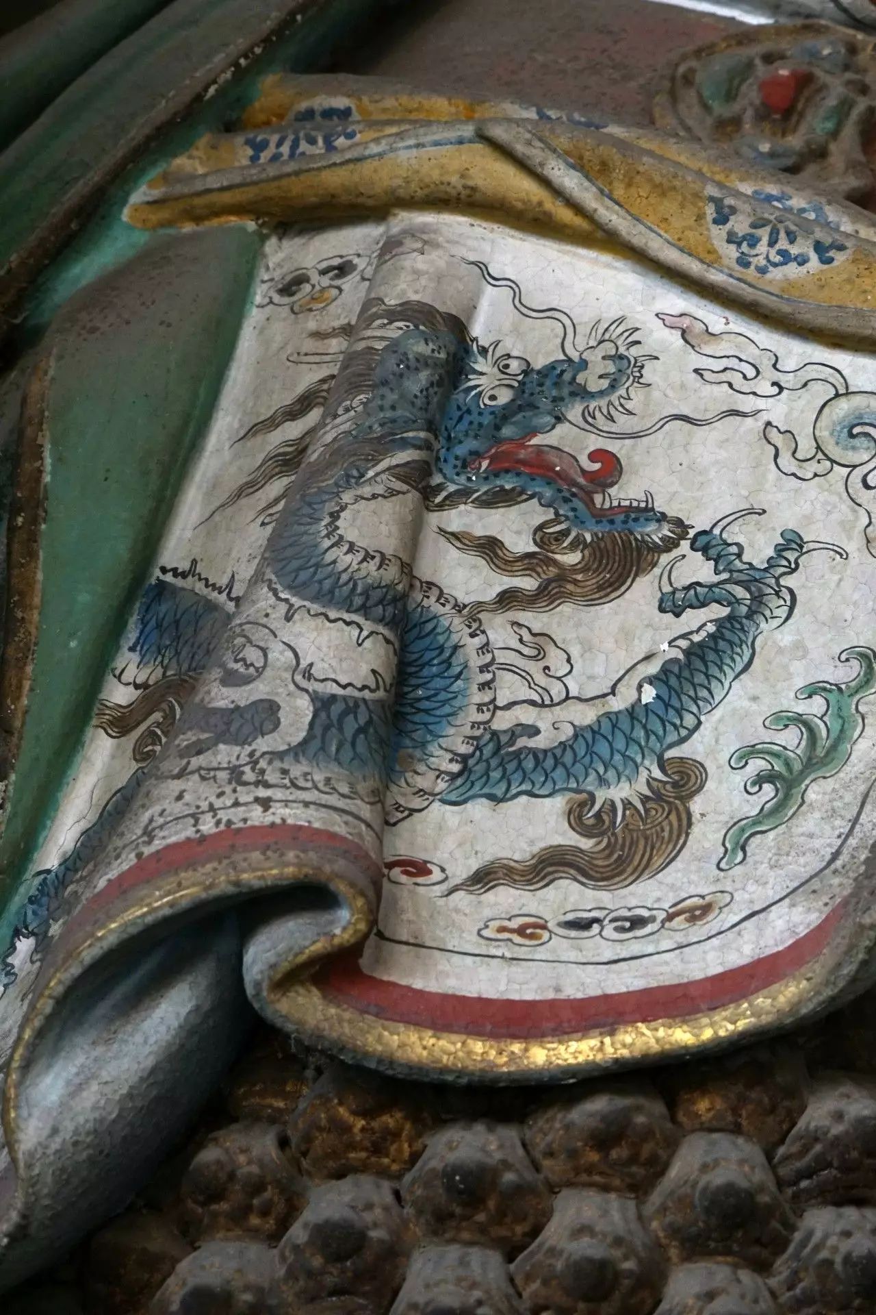在初步认定28尊彩色塑像名号的过程中,发现其组合排列及群体布局的构成,构思周密。不仅如此,在那缜密的思考中还注入了宗教宣传的功利意图。比如,是将帝后、文官武将、容貌修好的世俗裙钗、面目狰狞的神话人物穿插排列,使一字排开的众多塑像个体,在形式感上有着动静、收放、文野于服饰华丽或简约的对比变化,一方面减弱了所有塑像都以端正严肃的站立姿势,平均排列在须弥座上,把可能产生的呆板、单调的排列变成为有节奏变化的构成。