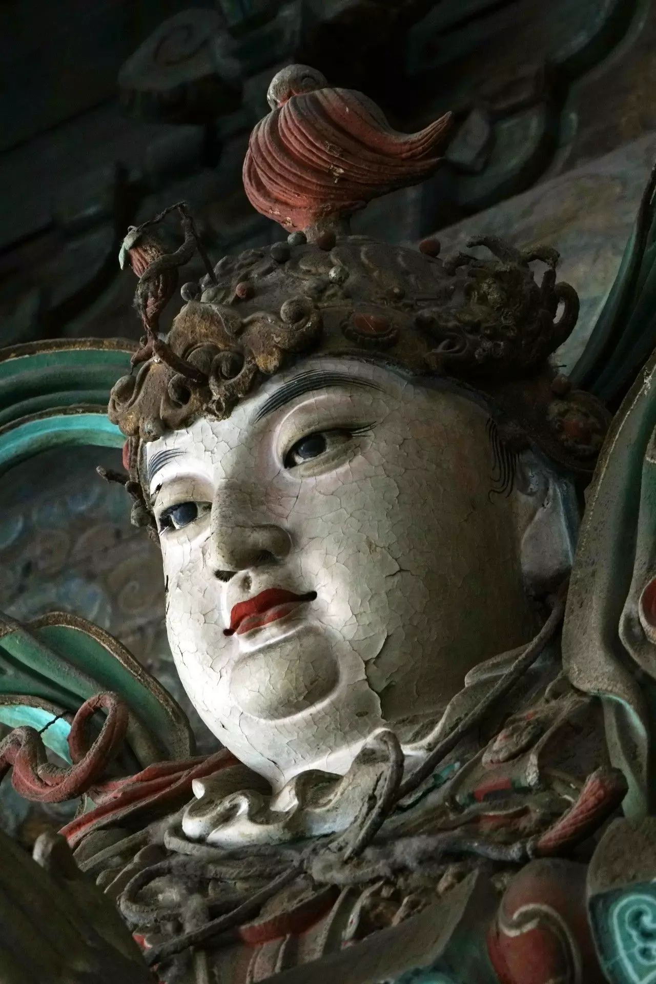 同时,又使一尊尊单体塑像在形式美感上有了内在联系,使众多高大塑像形成气势雄伟的群像阵容。而且还具有另外一种特征即精湛的彩绘。“塑容绘质”是中国传统雕塑的一大特色,无论是石刻造像还是泥塑造像,最后往往以着彩形式完成,彩绘在增强雕塑作品的表现力方面发挥了其他不可代替的作用。28尊彩色塑像的色彩、装銮浓重,以朱砂、黄丹、雄黄等矿物质原料为主,大量参用赤金、白银,形成富丽辉煌、金彩璀璨的艺术效果。另外,“开脸”的成功不可低估,28尊彩色塑像尊尊个性鲜明的性格和生动丰富的表情,在很大程度上是通过面部形象充分揭示的。形态生动逼真,充分显示了明代彩塑的艺术魅力。
