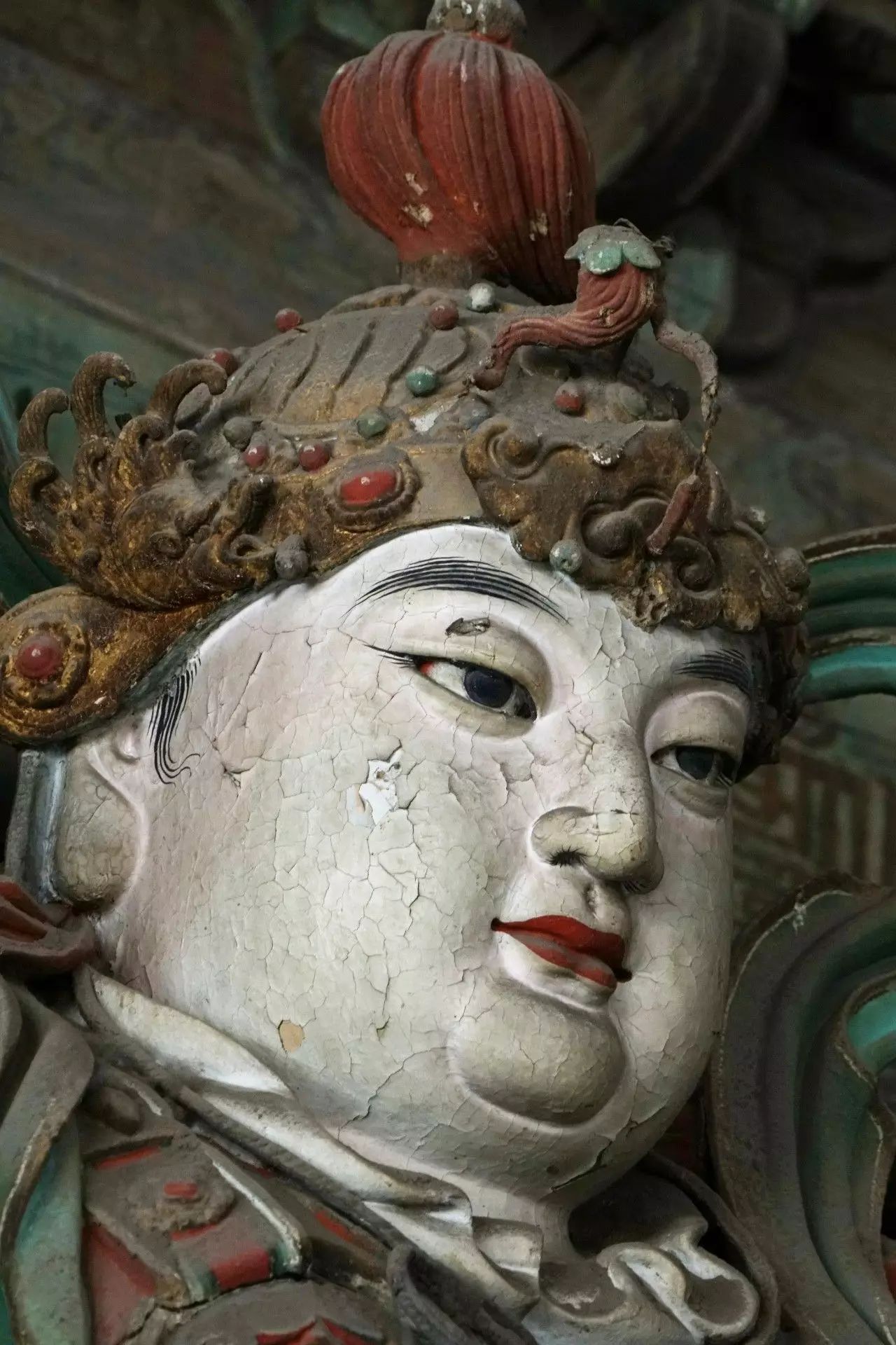 在初步认定28尊彩色塑像名号的过程中,发现其组合排列及群体布局的构成,构思周密。不仅如此,在那缜密的思考中还注入了宗教宣传的功利意图。比如,是将帝后、文官武将、容貌修好的世俗裙钗、面目狰狞的神话人物穿插排列,使一字排开的众多塑像个体,在形式感上有着动静、收放、文野于服饰华丽或简约的对比变化,一方面减弱了所有塑像都以端正严肃的站立姿势,平均排列在须弥座上,把可能产生的呆板、单调的排列变成为有节奏变化的构成。