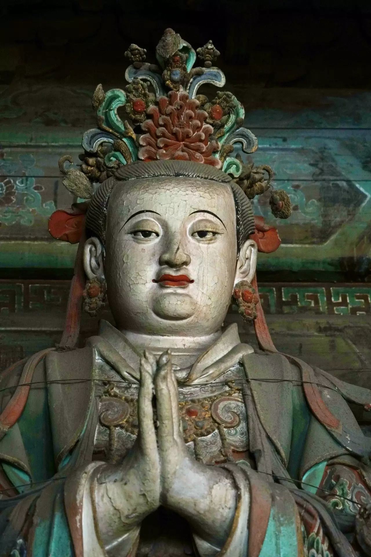 在初步认定28尊彩色塑像名号的过程中,发现其组合排列及群体布局的构成,构思周密。不仅如此,在那缜密的思考中还注入了宗教宣传的功利意图。比如,是将帝后、文官武将、容貌修好的世俗裙钗、面目狰狞的神话人物穿插排列,使一字排开的众多塑像个体,在形式感上有着动静、收放、文野于服饰华丽或简约的对比变化,一方面减弱了所有塑像都以端正严肃的站立姿势,平均排列在须弥座上,把可能产生的呆板、单调的排列变成为有节奏变化的构成。