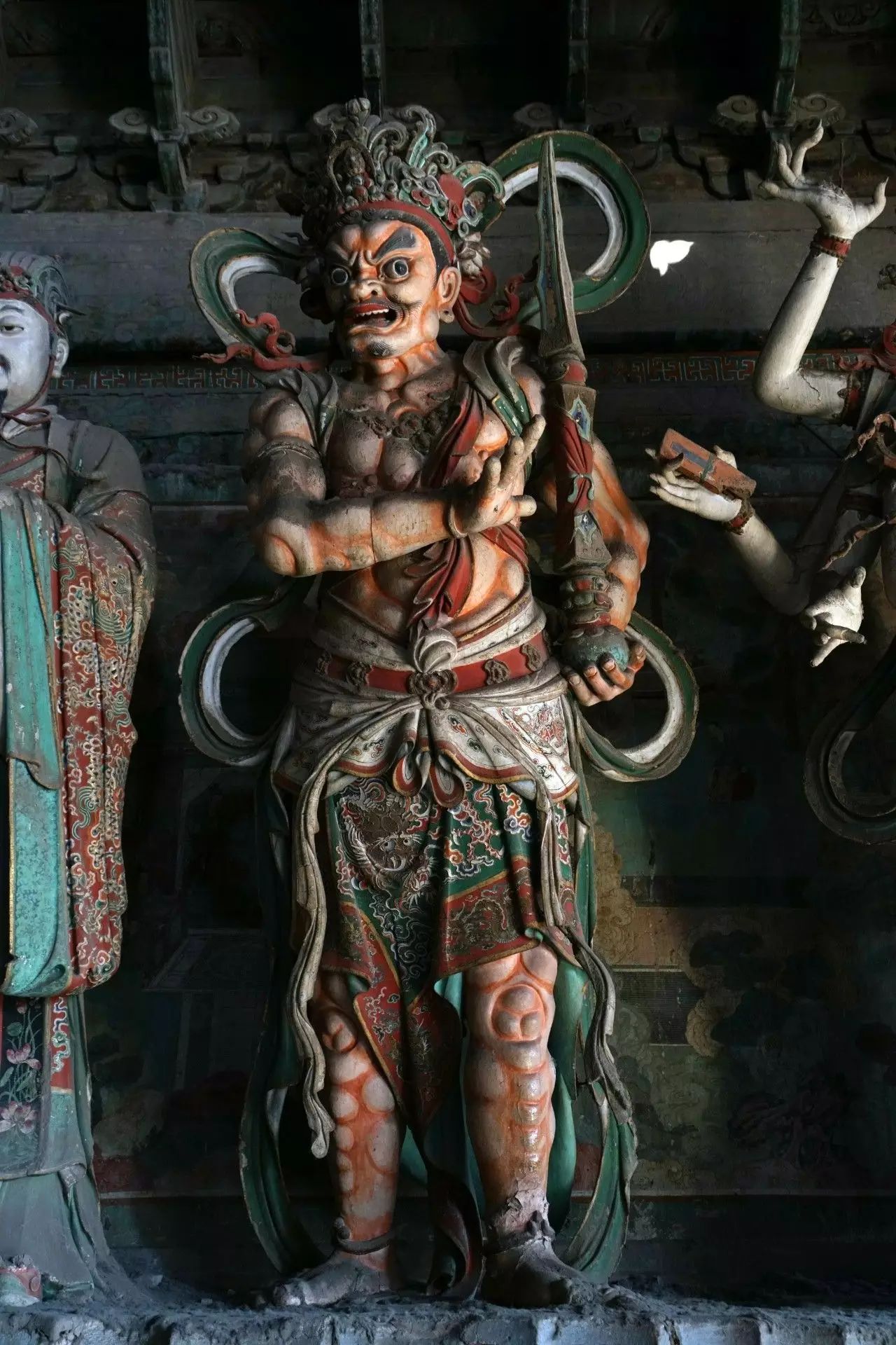 在初步认定28尊彩色塑像名号的过程中,发现其组合排列及群体布局的构成,构思周密。不仅如此,在那缜密的思考中还注入了宗教宣传的功利意图。比如,是将帝后、文官武将、容貌修好的世俗裙钗、面目狰狞的神话人物穿插排列,使一字排开的众多塑像个体,在形式感上有着动静、收放、文野于服饰华丽或简约的对比变化,一方面减弱了所有塑像都以端正严肃的站立姿势,平均排列在须弥座上,把可能产生的呆板、单调的排列变成为有节奏变化的构成。