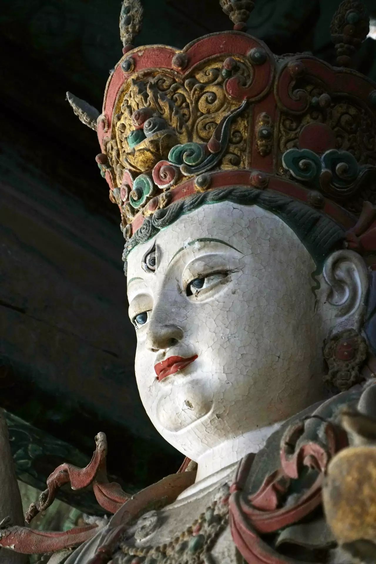 在初步认定28尊彩色塑像名号的过程中,发现其组合排列及群体布局的构成,构思周密。不仅如此,在那缜密的思考中还注入了宗教宣传的功利意图。比如,是将帝后、文官武将、容貌修好的世俗裙钗、面目狰狞的神话人物穿插排列,使一字排开的众多塑像个体,在形式感上有着动静、收放、文野于服饰华丽或简约的对比变化,一方面减弱了所有塑像都以端正严肃的站立姿势,平均排列在须弥座上,把可能产生的呆板、单调的排列变成为有节奏变化的构成。