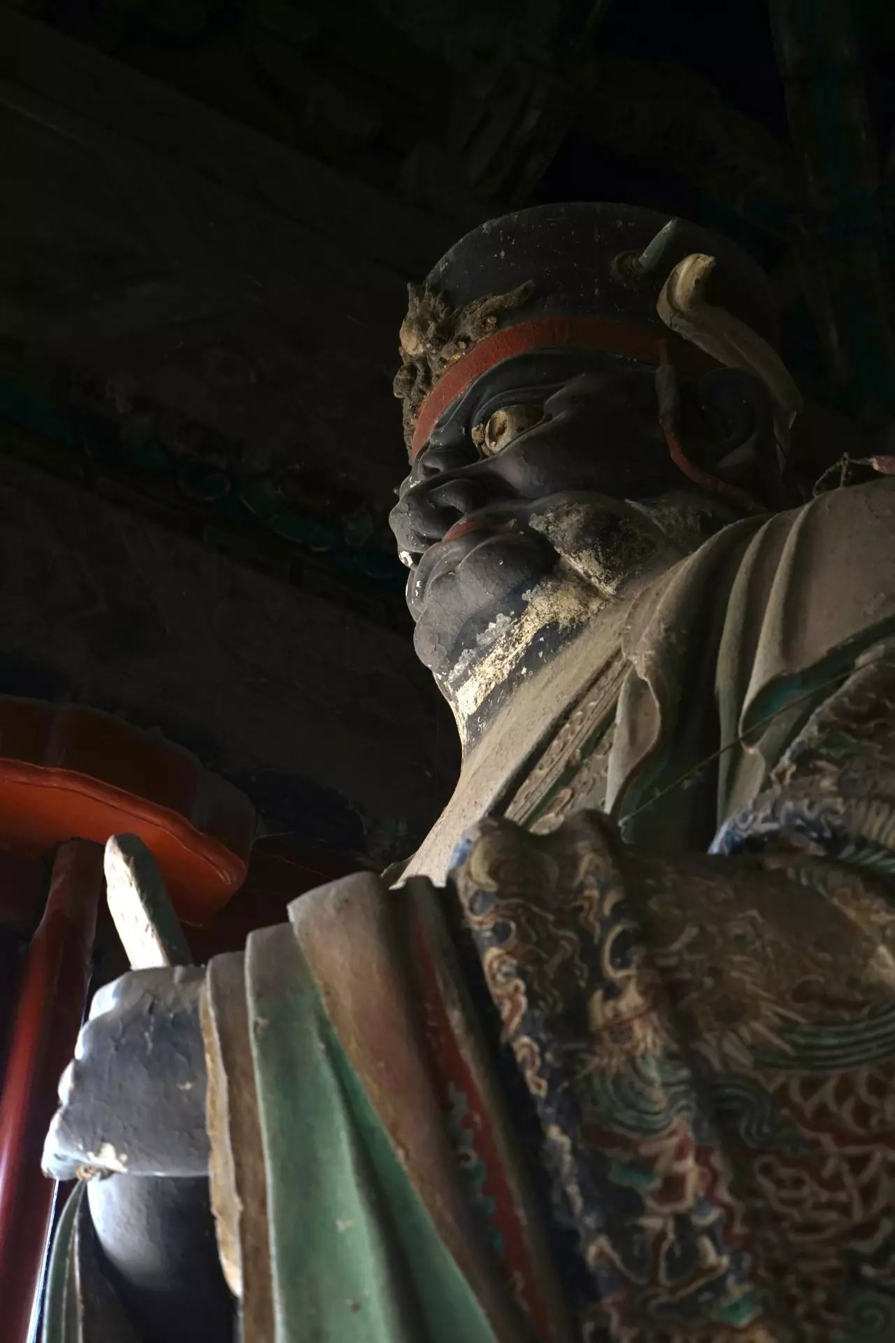 在初步认定28尊彩色塑像名号的过程中,发现其组合排列及群体布局的构成,构思周密。不仅如此,在那缜密的思考中还注入了宗教宣传的功利意图。比如,是将帝后、文官武将、容貌修好的世俗裙钗、面目狰狞的神话人物穿插排列,使一字排开的众多塑像个体,在形式感上有着动静、收放、文野于服饰华丽或简约的对比变化,一方面减弱了所有塑像都以端正严肃的站立姿势,平均排列在须弥座上,把可能产生的呆板、单调的排列变成为有节奏变化的构成。