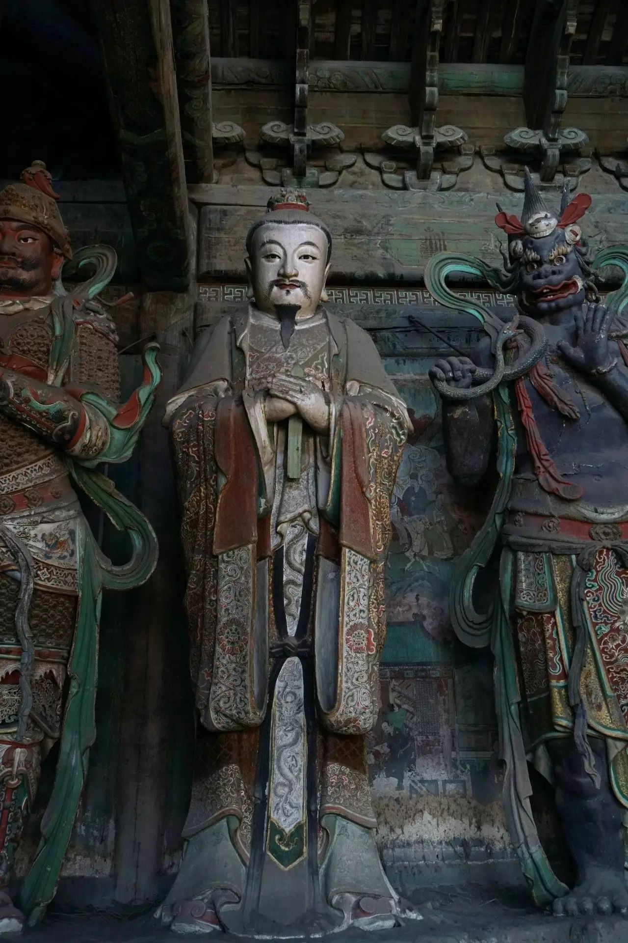 在初步认定28尊彩色塑像名号的过程中,发现其组合排列及群体布局的构成,构思周密。不仅如此,在那缜密的思考中还注入了宗教宣传的功利意图。比如,是将帝后、文官武将、容貌修好的世俗裙钗、面目狰狞的神话人物穿插排列,使一字排开的众多塑像个体,在形式感上有着动静、收放、文野于服饰华丽或简约的对比变化,一方面减弱了所有塑像都以端正严肃的站立姿势,平均排列在须弥座上,把可能产生的呆板、单调的排列变成为有节奏变化的构成。