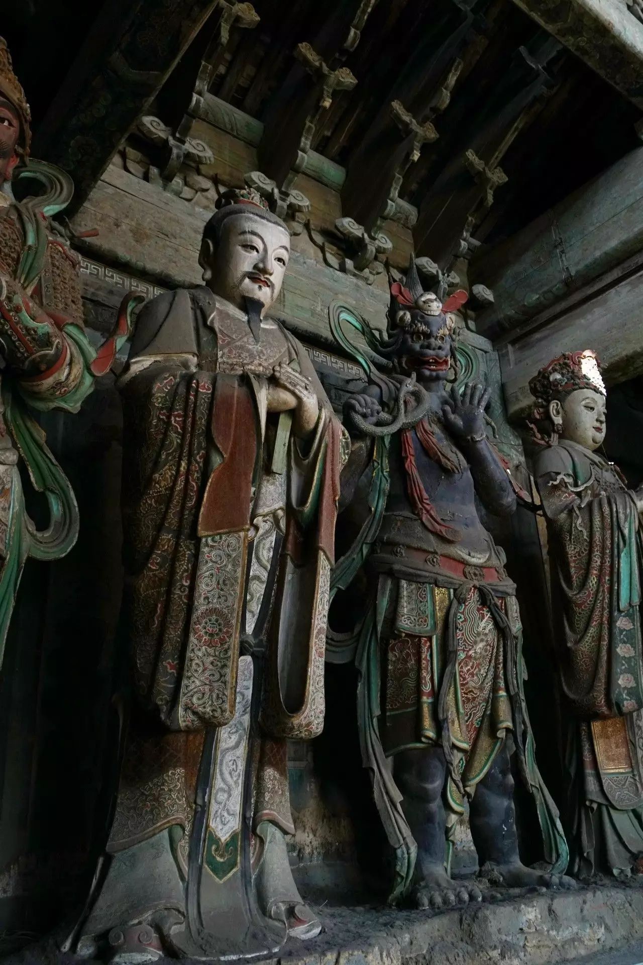 在初步认定28尊彩色塑像名号的过程中,发现其组合排列及群体布局的构成,构思周密。不仅如此,在那缜密的思考中还注入了宗教宣传的功利意图。比如,是将帝后、文官武将、容貌修好的世俗裙钗、面目狰狞的神话人物穿插排列,使一字排开的众多塑像个体,在形式感上有着动静、收放、文野于服饰华丽或简约的对比变化,一方面减弱了所有塑像都以端正严肃的站立姿势,平均排列在须弥座上,把可能产生的呆板、单调的排列变成为有节奏变化的构成。