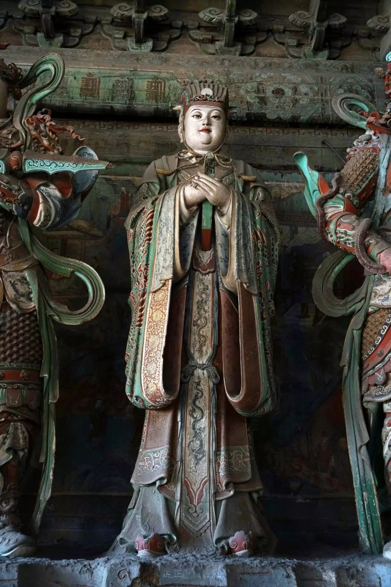 在初步认定28尊彩色塑像名号的过程中,发现其组合排列及群体布局的构成,构思周密。不仅如此,在那缜密的思考中还注入了宗教宣传的功利意图。比如,是将帝后、文官武将、容貌修好的世俗裙钗、面目狰狞的神话人物穿插排列,使一字排开的众多塑像个体,在形式感上有着动静、收放、文野于服饰华丽或简约的对比变化,一方面减弱了所有塑像都以端正严肃的站立姿势,平均排列在须弥座上,把可能产生的呆板、单调的排列变成为有节奏变化的构成。