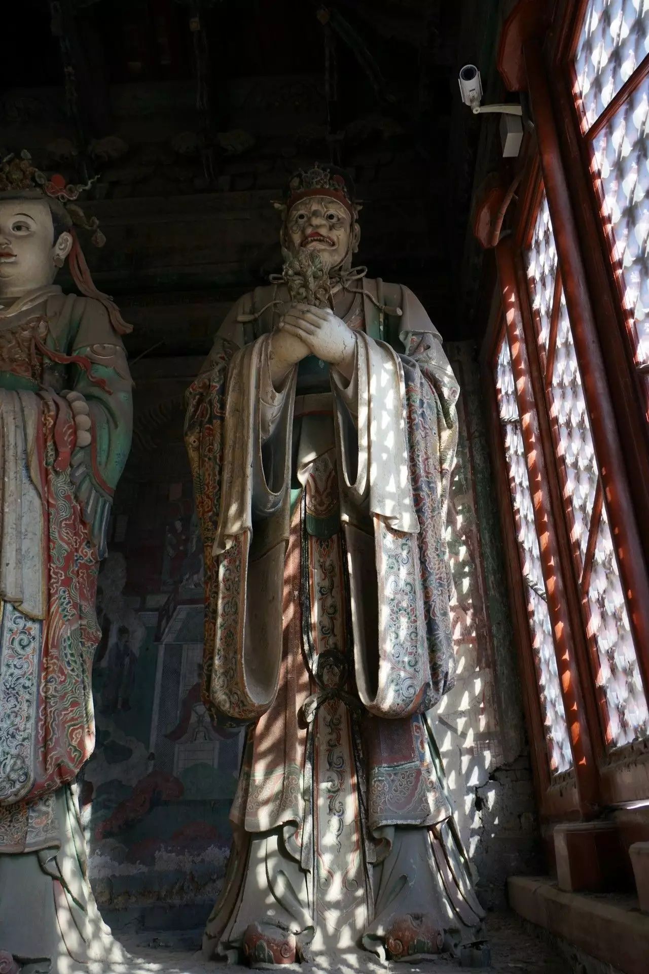 在初步认定28尊彩色塑像名号的过程中,发现其组合排列及群体布局的构成,构思周密。不仅如此,在那缜密的思考中还注入了宗教宣传的功利意图。比如,是将帝后、文官武将、容貌修好的世俗裙钗、面目狰狞的神话人物穿插排列,使一字排开的众多塑像个体,在形式感上有着动静、收放、文野于服饰华丽或简约的对比变化,一方面减弱了所有塑像都以端正严肃的站立姿势,平均排列在须弥座上,把可能产生的呆板、单调的排列变成为有节奏变化的构成。