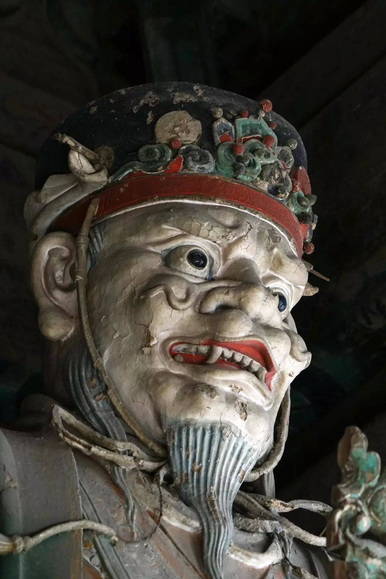在初步认定28尊彩色塑像名号的过程中,发现其组合排列及群体布局的构成,构思周密。不仅如此,在那缜密的思考中还注入了宗教宣传的功利意图。比如,是将帝后、文官武将、容貌修好的世俗裙钗、面目狰狞的神话人物穿插排列,使一字排开的众多塑像个体,在形式感上有着动静、收放、文野于服饰华丽或简约的对比变化,一方面减弱了所有塑像都以端正严肃的站立姿势,平均排列在须弥座上,把可能产生的呆板、单调的排列变成为有节奏变化的构成。