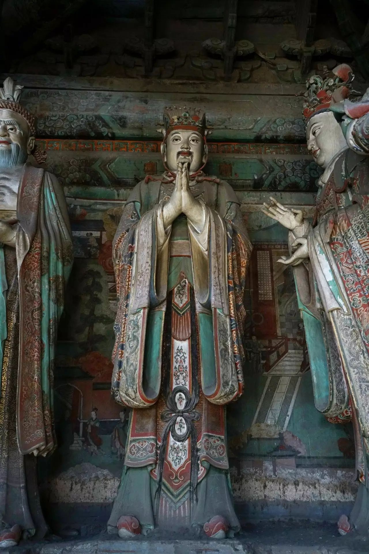 在初步认定28尊彩色塑像名号的过程中,发现其组合排列及群体布局的构成,构思周密。不仅如此,在那缜密的思考中还注入了宗教宣传的功利意图。比如,是将帝后、文官武将、容貌修好的世俗裙钗、面目狰狞的神话人物穿插排列,使一字排开的众多塑像个体,在形式感上有着动静、收放、文野于服饰华丽或简约的对比变化,一方面减弱了所有塑像都以端正严肃的站立姿势,平均排列在须弥座上,把可能产生的呆板、单调的排列变成为有节奏变化的构成。