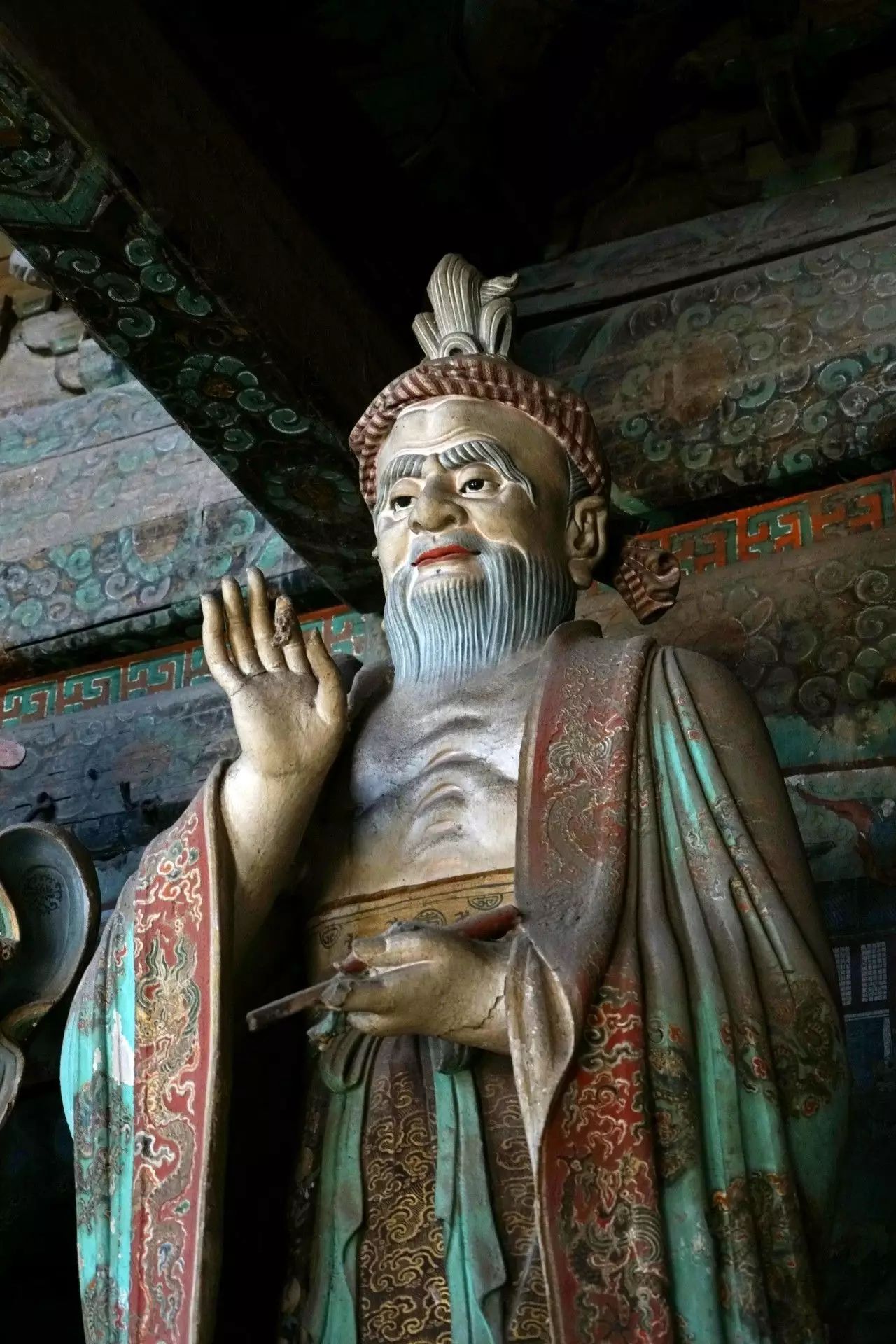 在初步认定28尊彩色塑像名号的过程中,发现其组合排列及群体布局的构成,构思周密。不仅如此,在那缜密的思考中还注入了宗教宣传的功利意图。比如,是将帝后、文官武将、容貌修好的世俗裙钗、面目狰狞的神话人物穿插排列,使一字排开的众多塑像个体,在形式感上有着动静、收放、文野于服饰华丽或简约的对比变化,一方面减弱了所有塑像都以端正严肃的站立姿势,平均排列在须弥座上,把可能产生的呆板、单调的排列变成为有节奏变化的构成。