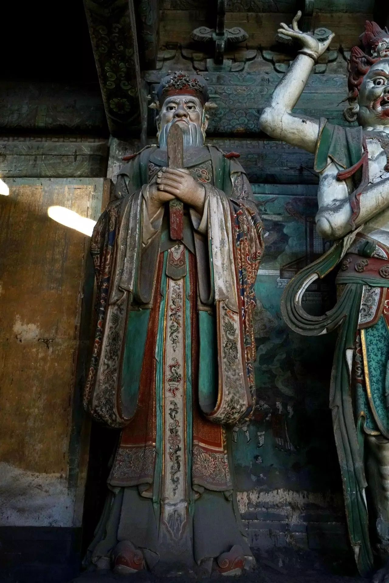 在初步认定28尊彩色塑像名号的过程中,发现其组合排列及群体布局的构成,构思周密。不仅如此,在那缜密的思考中还注入了宗教宣传的功利意图。比如,是将帝后、文官武将、容貌修好的世俗裙钗、面目狰狞的神话人物穿插排列,使一字排开的众多塑像个体,在形式感上有着动静、收放、文野于服饰华丽或简约的对比变化,一方面减弱了所有塑像都以端正严肃的站立姿势,平均排列在须弥座上,把可能产生的呆板、单调的排列变成为有节奏变化的构成。